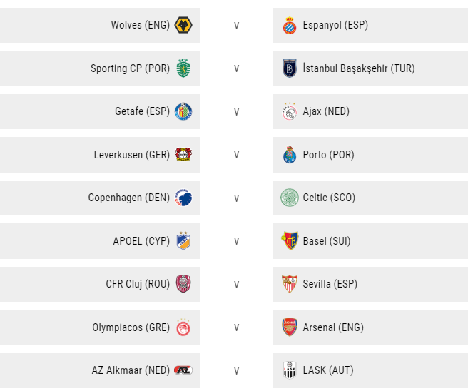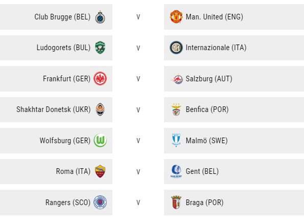Interi do të përballet me bullgarët e Ludogorets, ndërsa Roma do të gjejë përballë belgët e Gent. Mançestër Junajtet do të sfidojë një tjetër skuadër belge, Klub Bruzh. Ndërsa Arsenali do të luajë me Olipiakos. Spanjollët e Sevijas do të luajnë me rumunët e Kluzh.