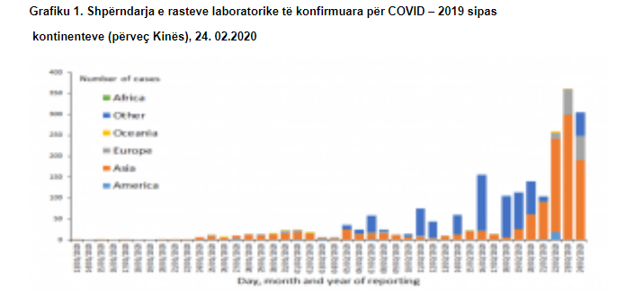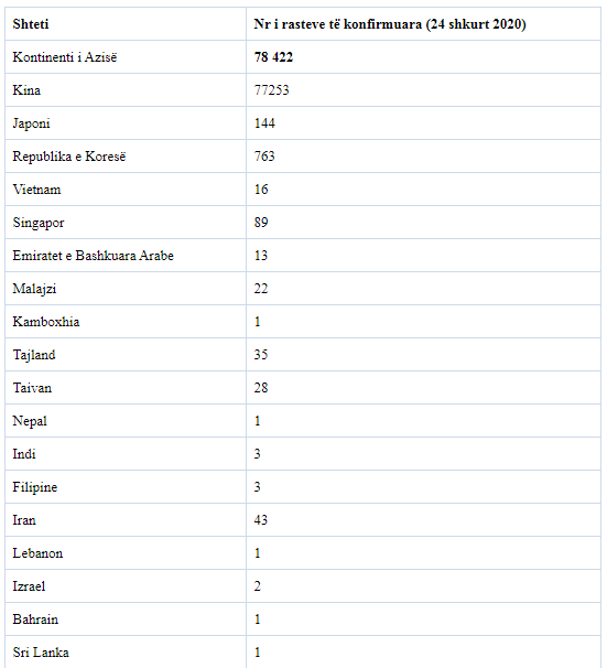 Në nivel global, janë raportuar në total 79 360 raste të konfirmuara me COVID – 2019. Sipas të dhënave nga Qendra Evropiane për Parandalimin dhe Kontrollin e Sëmundjeve, rastet më të shumta janë në Azi, kontinenti ku lindi virusi, me 78.422 raste të konfirmuara dhe 2.616 vdekje, e ndjekur nga Europa me 182 raste të konfirmuara dhe 3 vdekje, Amerika me 44 raste të konfirmuara, gjysma në Australi dhe 1 në Afrikë. Përveç Azisë dhe Europës, virusi nuk raportohet të ketë shkaktuar viktima në pjesën tjetër të globit.