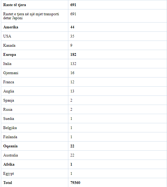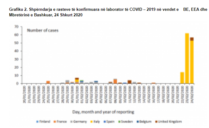 Sipas të njëjtave burime, në Europë janë 182 raste të konfirmuara dhe 3 vdekje. Italia rezulton shteti më i prekur me 132 raste të konfirmuara. Italia gjithashtu rezulton shteti i katërt më i prekur në botë nga koronavirusi, pas Kinës, Japonisë dhe Koresë së Jugut.