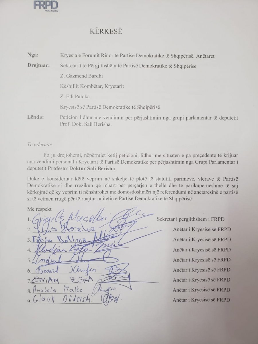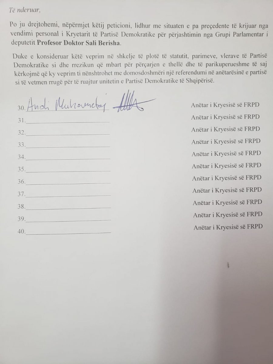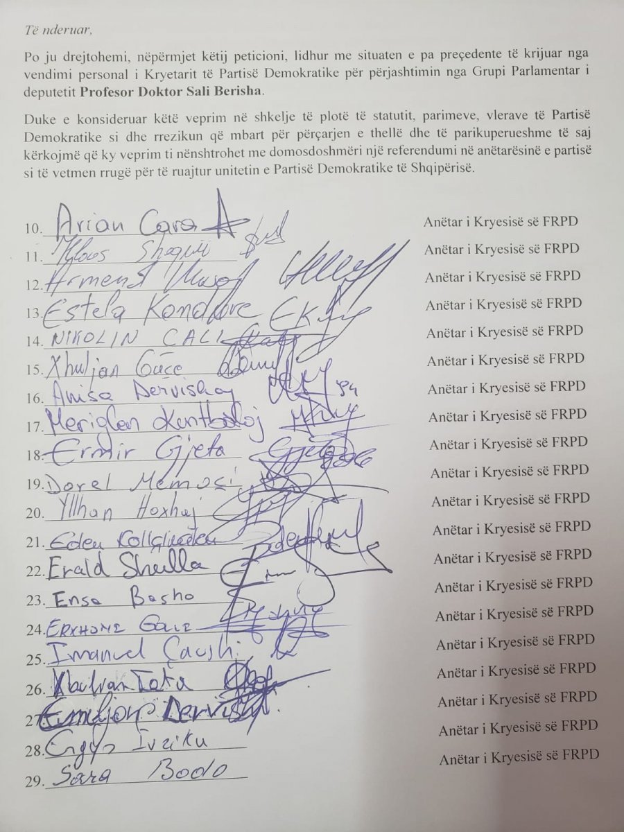 “Po ju drejtohemi, nëpërmjet këtij peticioni, lidhur me situatën e pa precedentë të krijuar nga vendimi personal i Kryetarit të Partisë Demokratike për përjashtimin nga Grupi Parlamentar i deputetit Profesor Doktor Sali Berisha. Duke e konsideruar këtë veprim në shkelje të plotë të statutit, parimeve, vlerave të Partisë Demokratike si dhe rrezikun që mbart për përçarjen e thellë dhe të parikuperueshme të saj kërkojmë qe: ky veprim ti nënshtrohet me domosdoshmëri një referendumi në anëtarësinë e partisë si të vetmen rruge për të ruajtur unitetin e Partisë Demokratike të Shqipërisë”, shkruhet në peticionin me 30 firma.