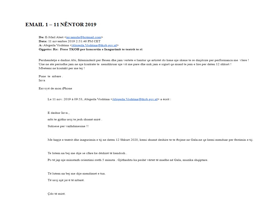 Po ashtu TKOB ka publikuar edhe mesazhet dhe email-et e dërguara në tre periudha të ndryshme. Email-i i fundit zyrtar nga Drejtoresha Artistike e TKOB, Abigeila Voshtina është dërguar në adresë të sopranos më 19 korrik të këtij viti.