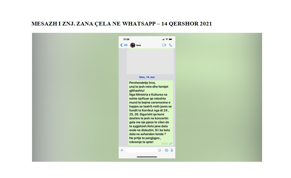 “Sqarojmë gjithashtu se një muaj përpara ftesës së fundit zyrtare të bërë nga Drejtoresha Artistike, znj. Voshtina (në email-in e datës 19 KORRIK 2021), Drejtoresha e Përgjithshme e TKOBAP-së, znj. Zana Çela i ka dërguar në datë 14 QERSHOR 2021 një mesazh shoqëror në WhatsApp, znj.Mula, por edhe në këtë rast nuk ka patur asnjë përgjigje. Më poshtë gjeni të renditur sipas datave ftesat zyrtare në email dhe mesazhin.”, -thuhet në reagimin e TKOB.