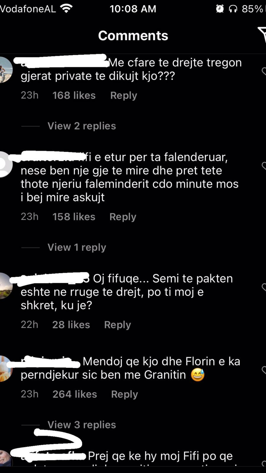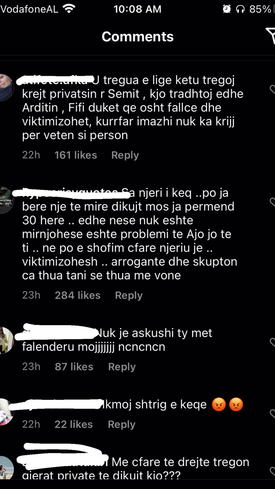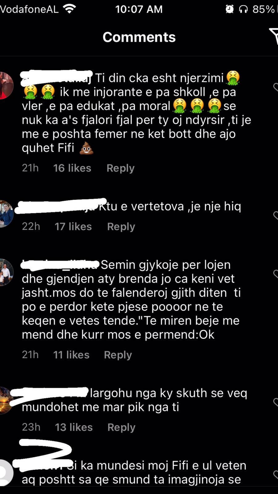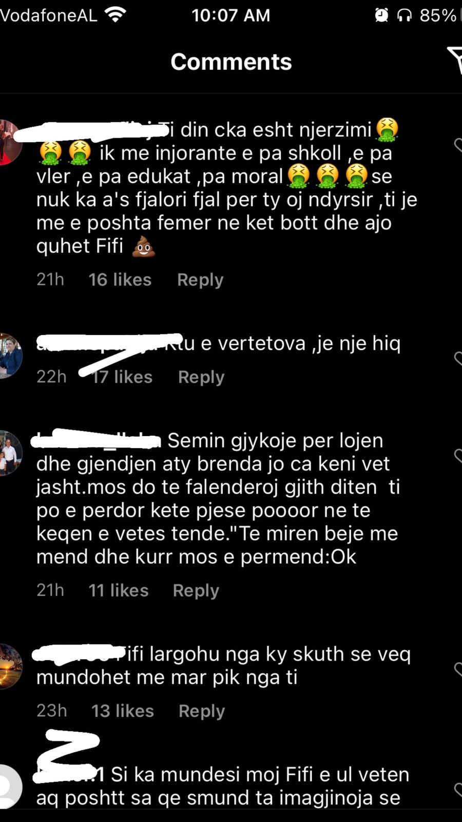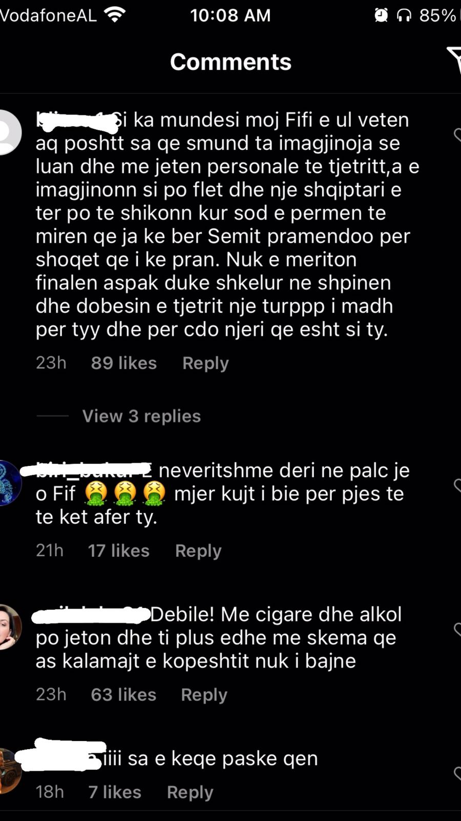 “Njeri i keq, po ia bëre një të mirë një njeriu mos ja përmend 30 herë, ti po viktimizohesh”; “Krijesë e pështirë”; “Je femra më e poshtër në botë, a e di çfarë është njerëzimi”; “Me çfarë të drejte tregon gjërat private të dikujt tjetër?”; “Je e etur për të të falenderuar, ti pret të të thonë faleminderit gjithë kohës për një gjë”; “Si ka mundësi e ul veten aq poshtë kjo Fifi dhe luan me jetën personale të dikujt tjetër”; “Ka shkeulur në shpinën dhe dobësinë e tjetrit. Shumë turp”; “Mjer kujt i bie me të pas afër ty” – ishin vetëm disa nga qindra komentet e tjera.