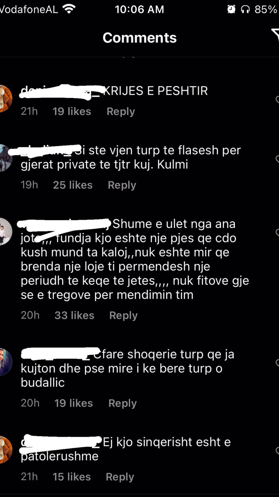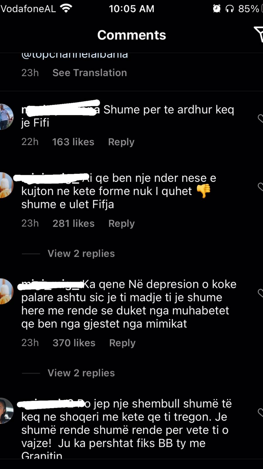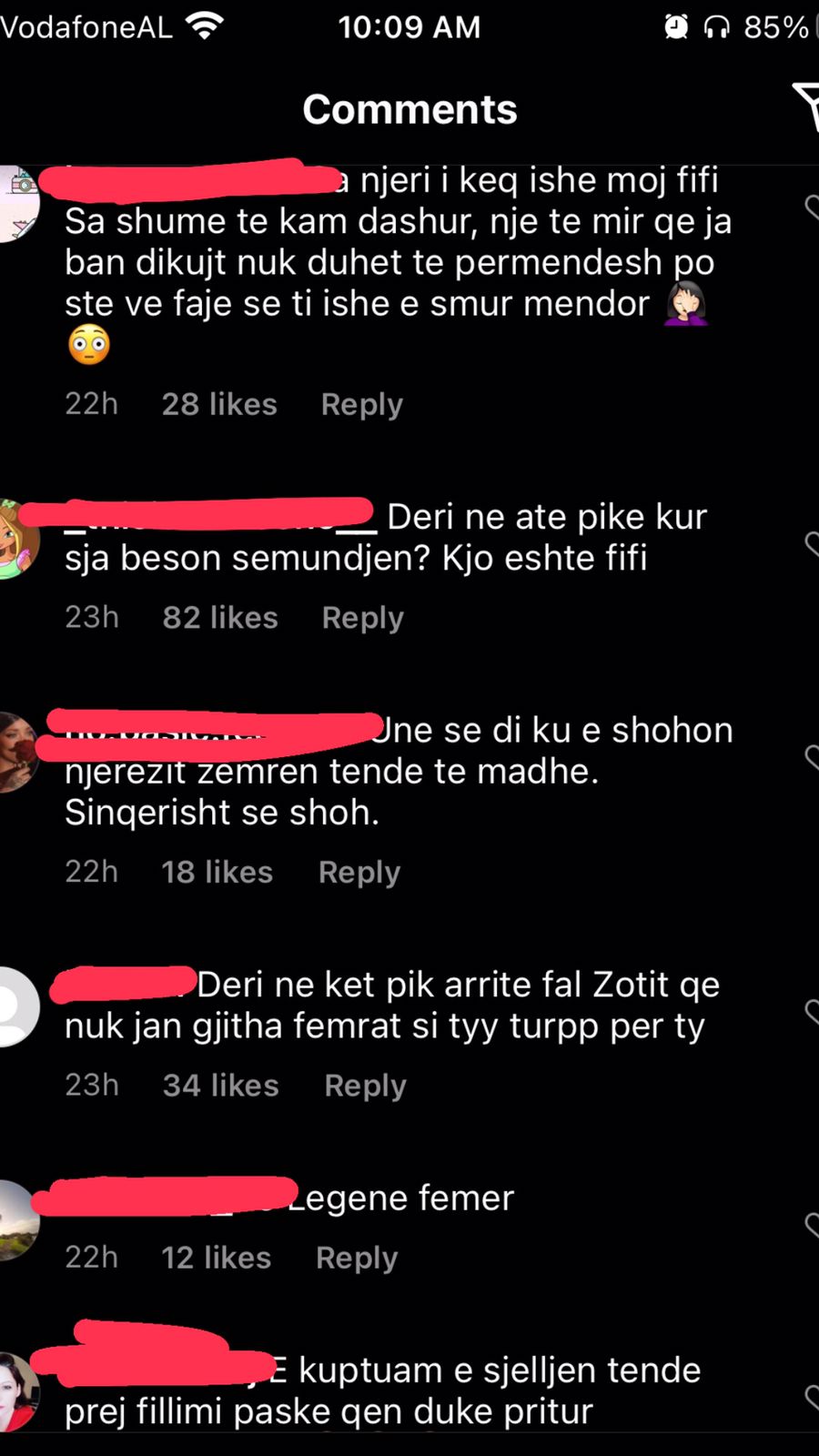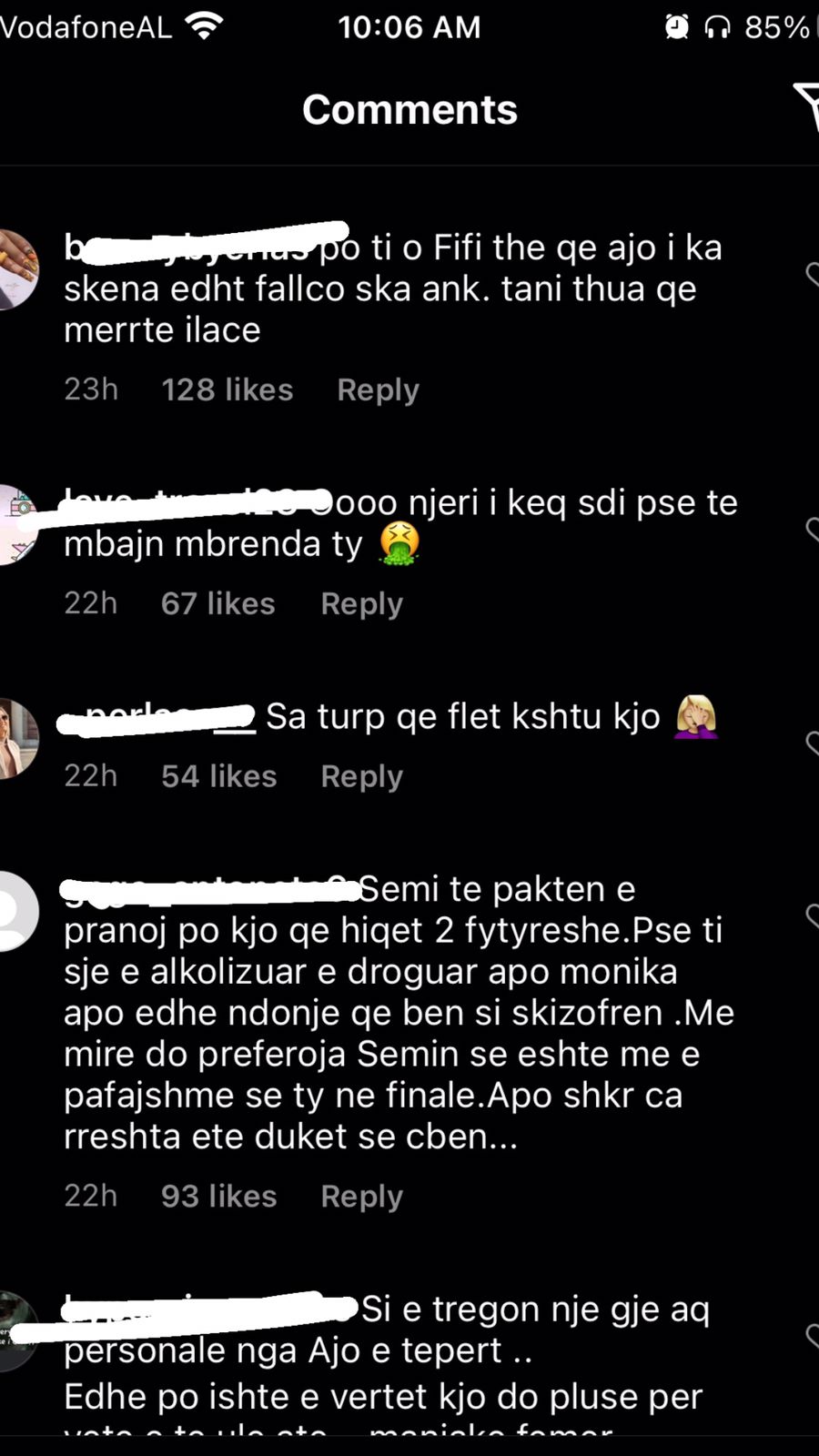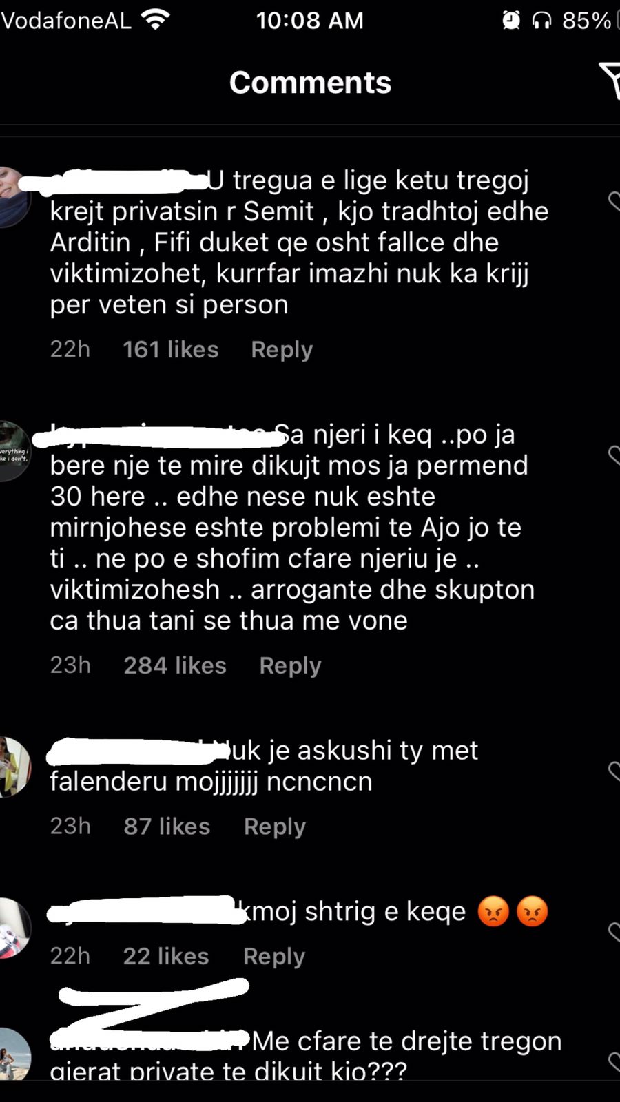 “Njeri i keq, po ia bëre një të mirë një njeriu mos ja përmend 30 herë, ti po viktimizohesh”; “Krijesë e pështirë”; “Je femra më e poshtër në botë, a e di çfarë është njerëzimi”; “Me çfarë të drejte tregon gjërat private të dikujt tjetër?”; “Je e etur për të të falenderuar, ti pret të të thonë faleminderit gjithë kohës për një gjë”; “Si ka mundësi e ul veten aq poshtë kjo Fifi dhe luan me jetën personale të dikujt tjetër”; “Ka shkeulur në shpinën dhe dobësinë e tjetrit. Shumë turp”; “Mjer kujt i bie me të pas afër ty” – ishin vetëm disa nga qindra komentet e tjera.