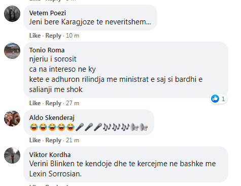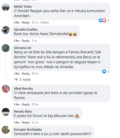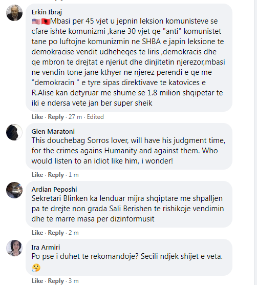 “Kimete lexo ndonjë koment nga këto që të kuptosh se çfarë po i bën mardhënive Shqipëri- Amerikë. Sorosiane e vogël”, shkruhej në një koment.