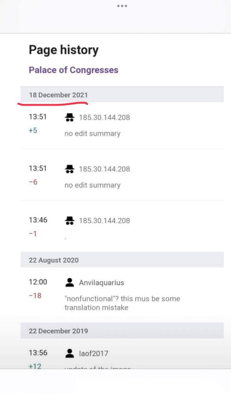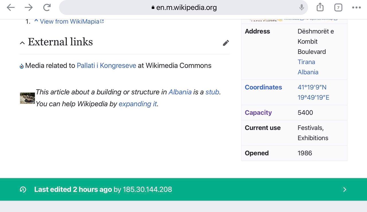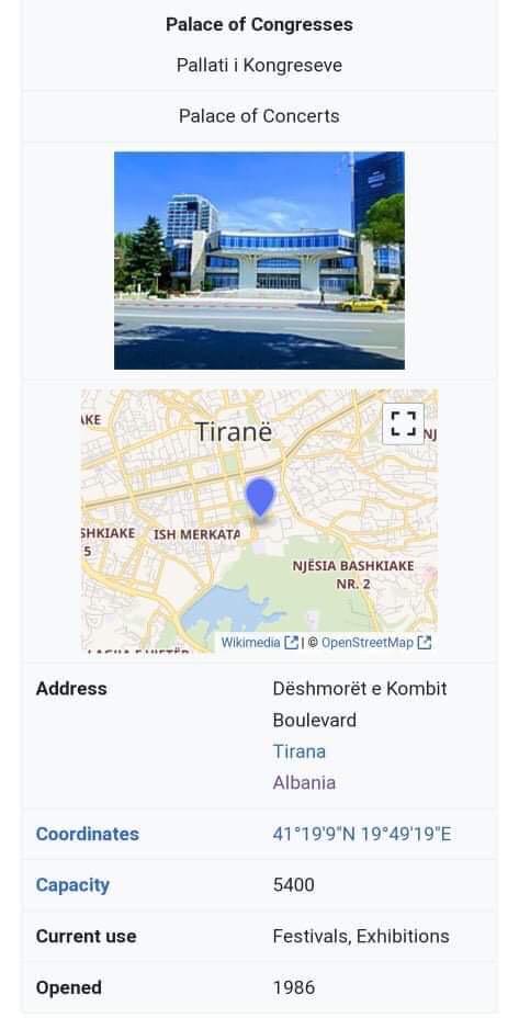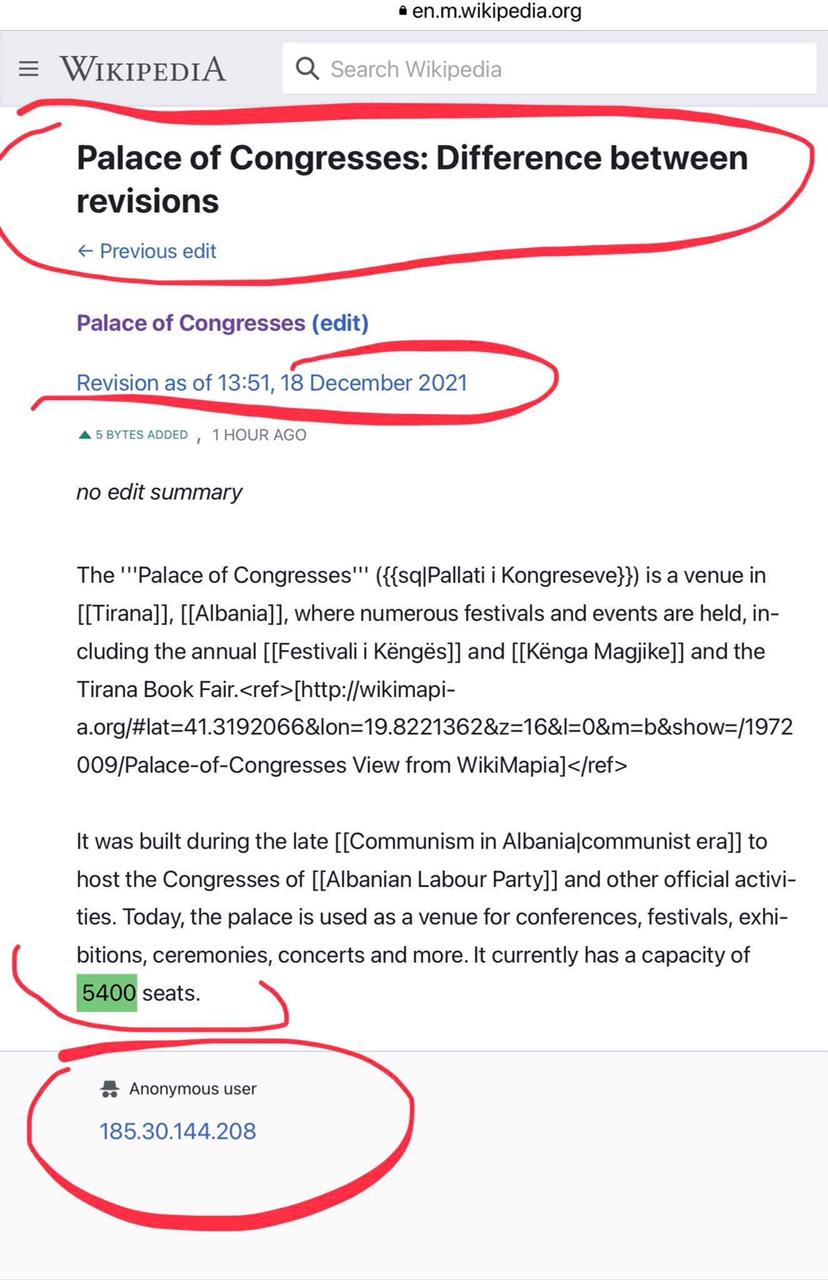 Por ajo që bie në sy pas lajmit të publikuar nga mediat duke iu referuar këtyre burimeve publike, se kjo sallë nuk ka kapacitet për aq delegatë të deklarua sot, është ndërhyrë në faqen e Wikipedias duke e ndryshuar kapacitetin e sallës në 5400.