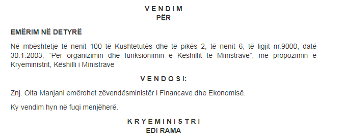 Olta Manjani emërohet zëvendësministër i Financave dhe Ekonomisë. Ajo zë vendin e Dajna Sorensen, e liruar nga kjo detyrë.