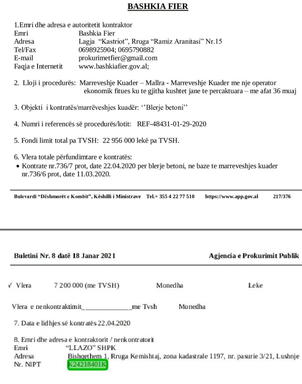 Hulumtimin po e nisim nga muaji janar 2021, ku në Bashkinë Fier, kompania Llazo ka fituar tenderin me objekt “blerje betoni”. Fondi limit i këtij tenderi ishte 22 956 000 lekë pa TVSH.