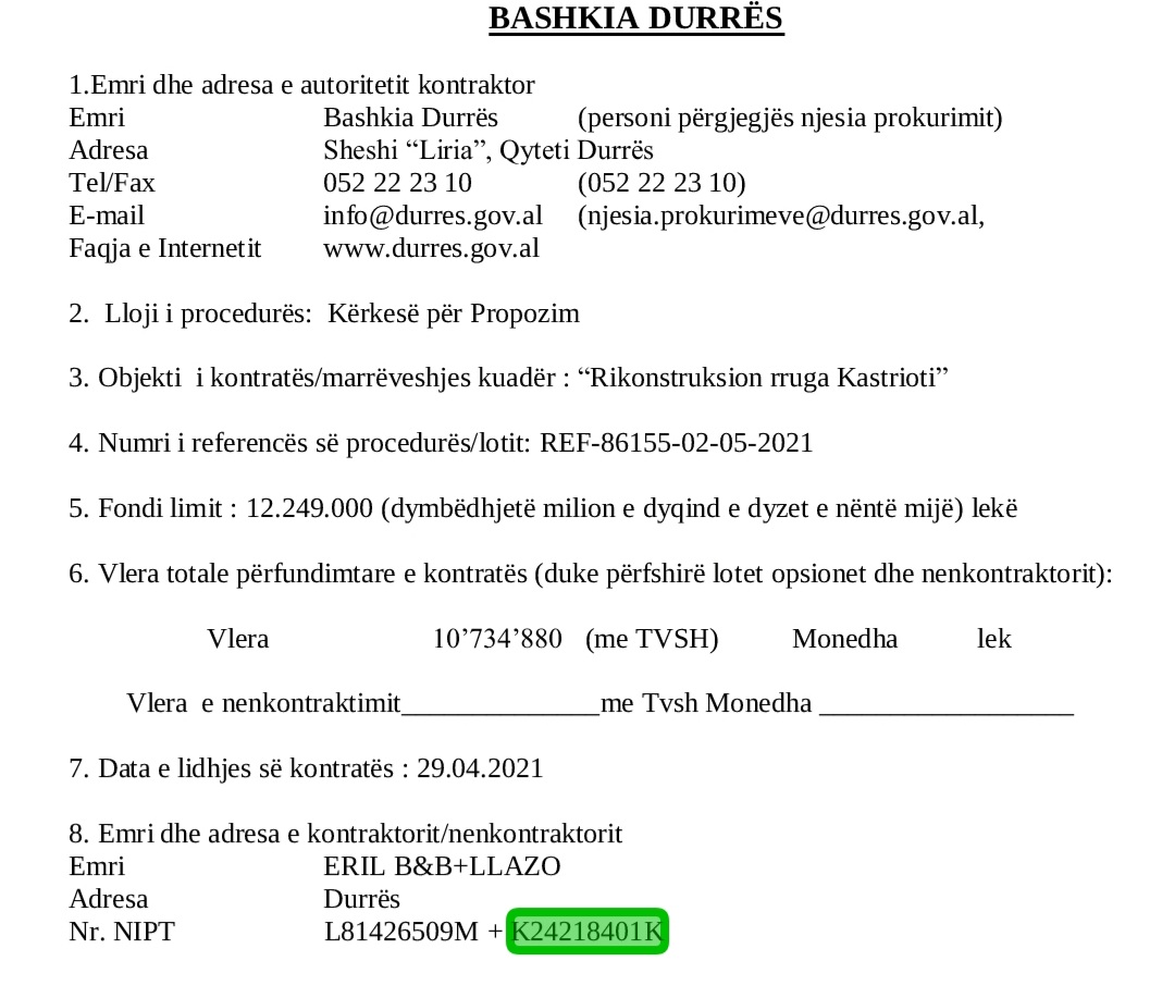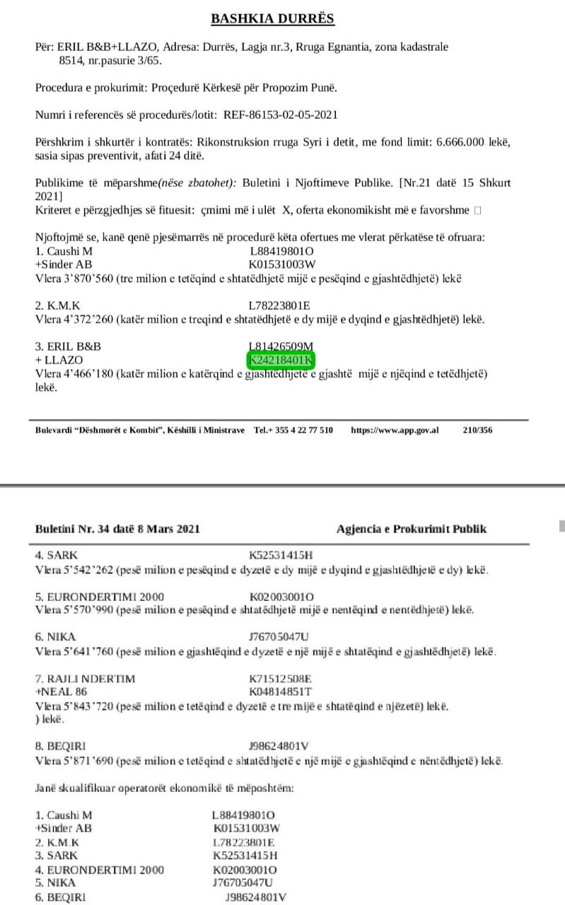 Ndërkohë, sipas dokumenteve që disponon redaksia jonë, Llazo ka vijuar të fitojë tendera me favorizime. Kësaj herë nga Durrës, e cila bëri tender me objekt rikonstruksion i rrugës “Syri i Detit”, ku fondi ishte 66 milionë lekë të vjetra. Oferta më e ulët ka qenë me vlerë 38 milionë lekë, ndërkohe Llazo është shpallur fitues me një ofertë prej 44 milionë lekësh. Pra, për një tender të thjeshtë rikonstruksioni fiton firma që ofron më shumë. Aq më tepër një firmë nga Bishtqethmi!