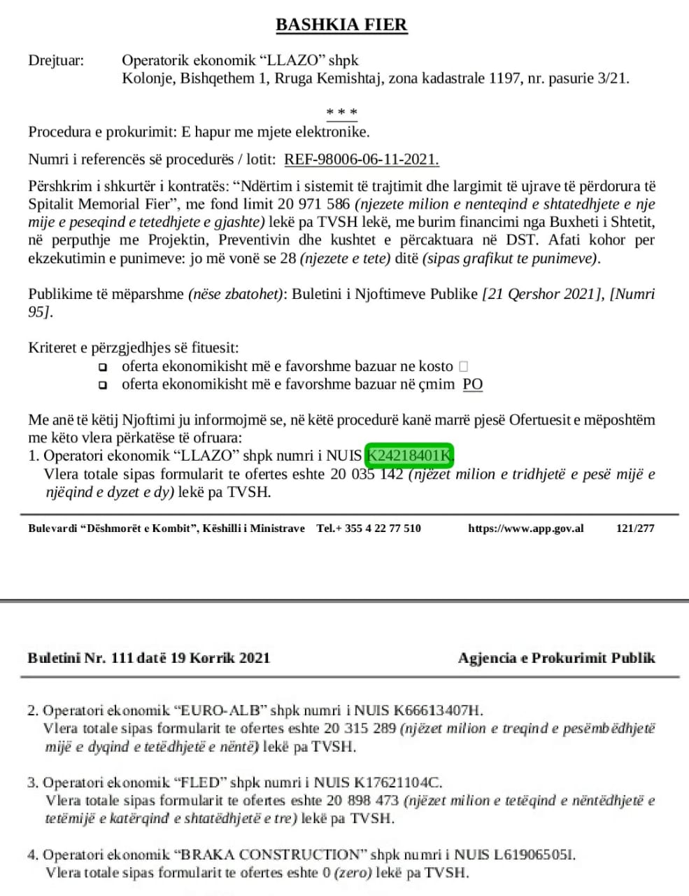 E njëjta bashki dhe kryebashkiak e ka shpallur fitues edhe në tenderin “ndërtim i sistemit të trajtimit dhe largimit të ujërave të përdorura të Spitalit Memorial Fier”, me fond limit 20 971 586 lekë. Në këtë tender Llazo ka garuar me veten!