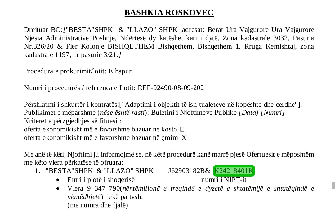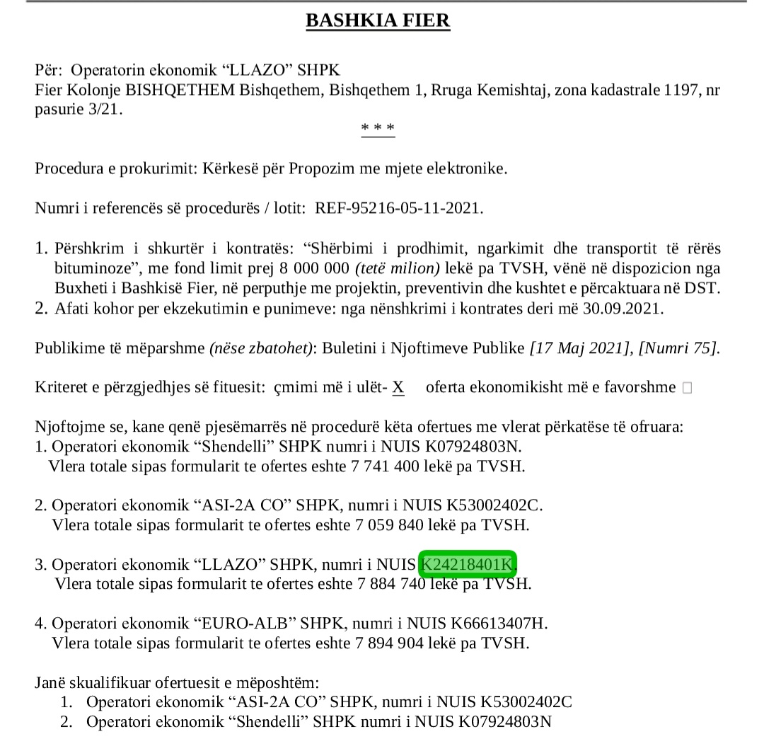 Por, tendera ka fituar edhe në Bashkinë e Fierit, e cila ka bërë tender “shërbimi i prodhimit, ngarkimit dhe transportit të rërës bituminoze”, me fond limit prej 8 000 000. Ose me TVSH rreth 80 mijë euro. Edhe në këtë rast, Llazo s’ka pasur ofertën më të lartë, por sërish Subashi e ka shpallur fitues.