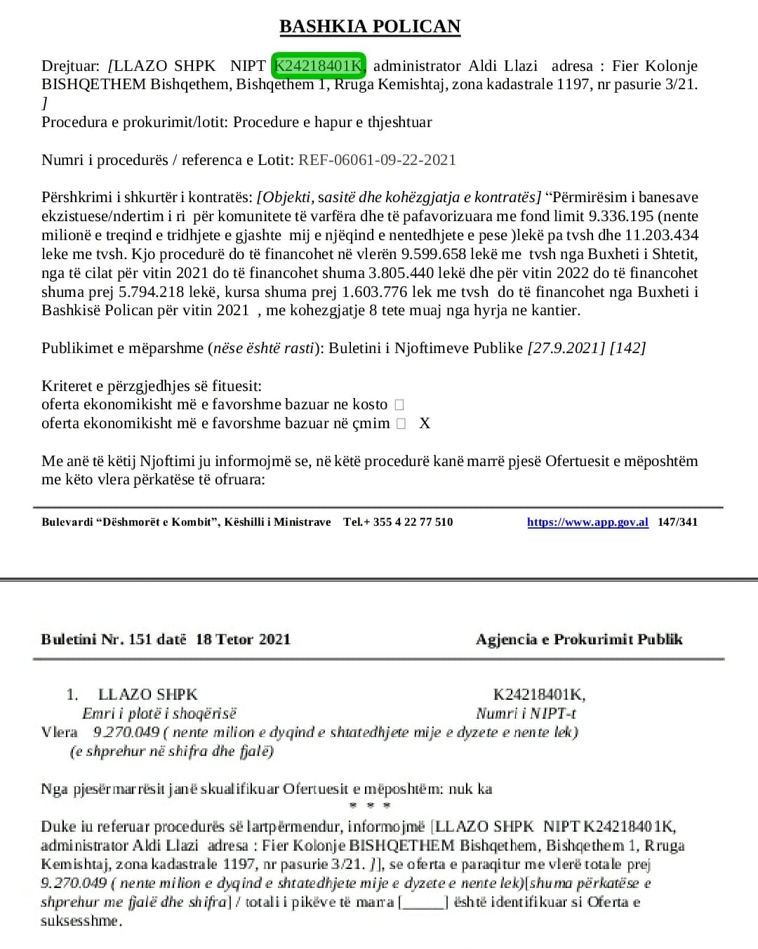 Në juglindje të Roskovecit, në Poliçan, Llazo ka fituar tenderin me objekt “përmirësim i banesave ekzistuese/ndërtim i ri për komunitete të varfëra dhe të pafavorizuara me fond limit 9.336.195”. “Guvernatori” i Poliçanit, Adriatik Zotkaj, e shpalli fitues, ose më saktë Llazo ka qenë e vetme në garë.