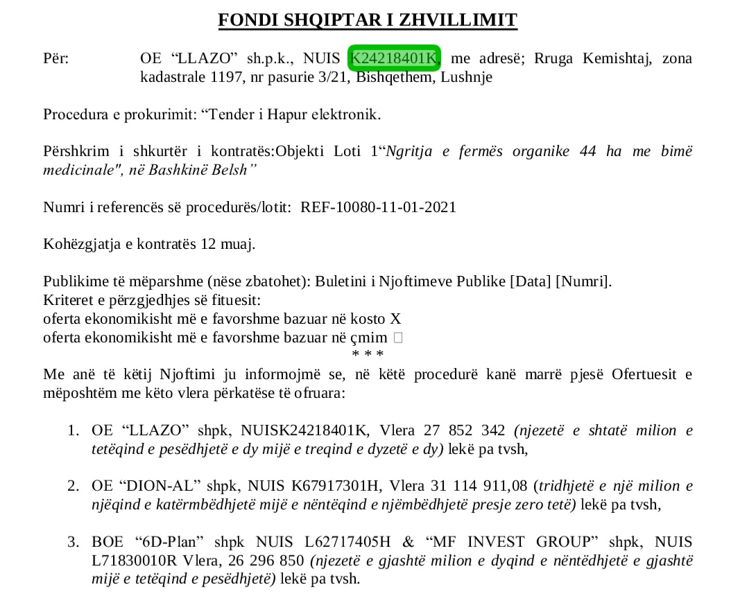 Por, qershia mbi tortë ka qenë tenderi i Fondit Shqiptar të Zhvillimit, i cili shpalli fitues Llazo-n për tenderin me objekt “ngritja e fermës organike 44 ha me bimë medicinale”, në Bashkinë Belsh”.