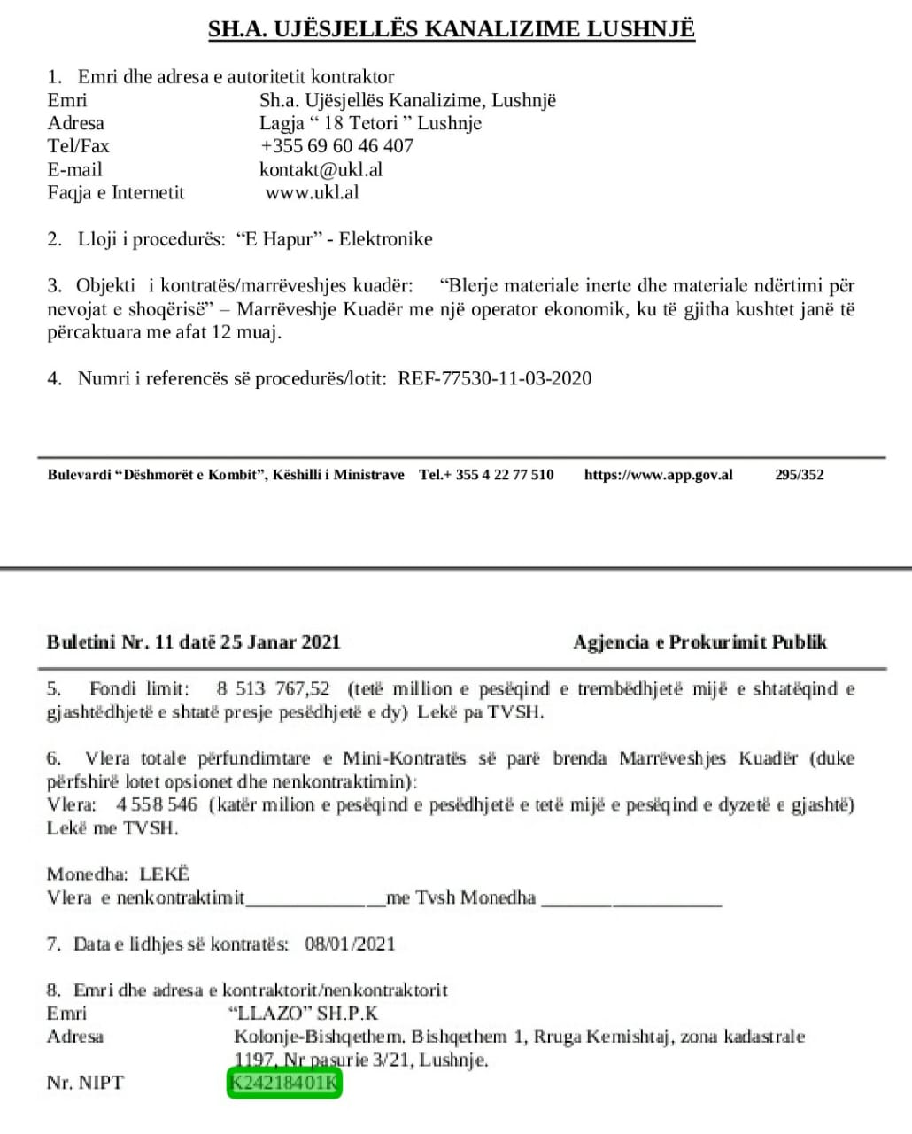 Llazo ka vijuar të fitojë tendera, kësaj herë me objekt “Blerje materiale inerte dhe materiale ndërtimi për nevojat e shoqërisë”. Kësaj herë tenderi ka qenë me vlerë 100 milionë lekë të vjetra me TVSH. Pra, një tender në “shtëpi”, në bashkitë e të cilave njerëzit “hije” të Llazo-s kanë influenca te mëdha.