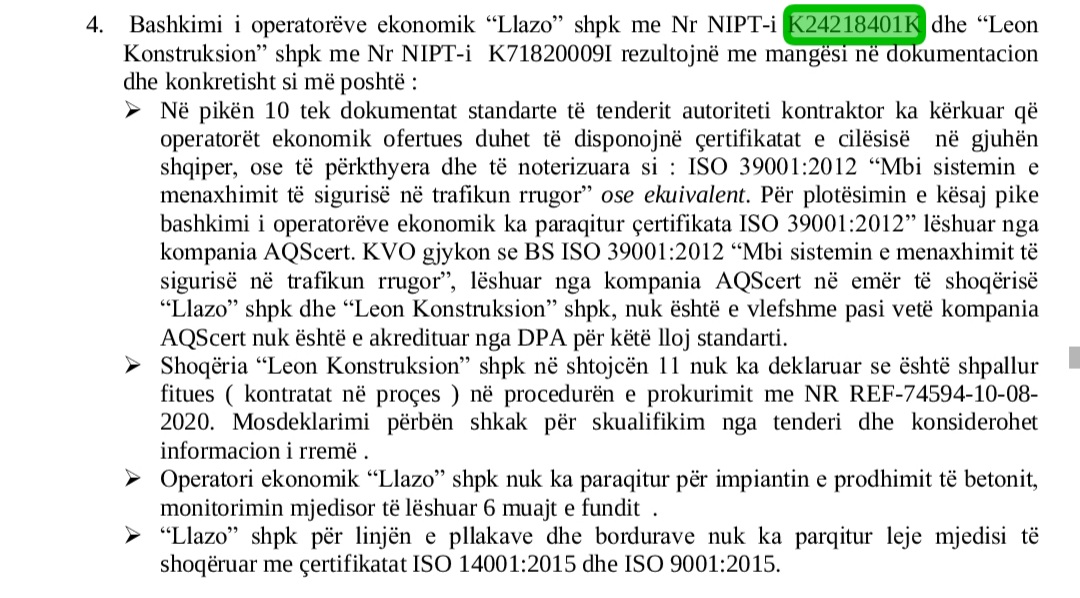 Ndërkohë, në një dokument tjetër, Llazo është s’kualifikuar me arsyetimin se “nuk disponon certifikatat e cilësisë”.