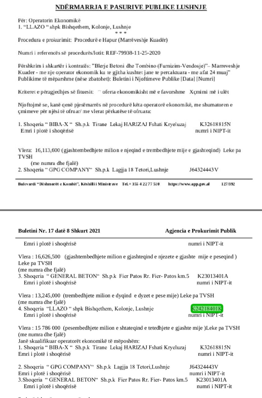 Tenderi i radhës ka qenë po në Lushnje, kësaj herë nga Ndërmarrja Publike e Pasurive në Lushnje, për blerje betoni dhe turbino. Në këtë procedurë morën pjesë disa kompani, ku Llazo ka bërë një ofertë prej 157 milionë lekësh të vjetra. Ndërkohë, ka pasur oferta edhe 130 milionë, por janë s’kualifikuar!