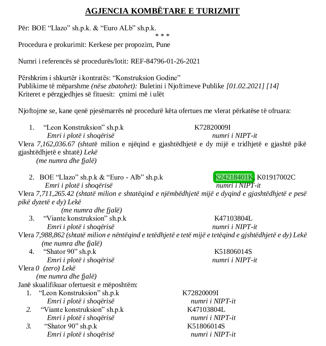 Por, harta e tenderëve të Llazo-s zgjerohet edhe në Agjencinë Kombëtare të Turizmit, e cila ka bërë tenderin “konstruksion godine”. Oferta më e ulët ka qenë 71 milionë lekë, ndërsa Llazo ka ofruar 77 milionë.