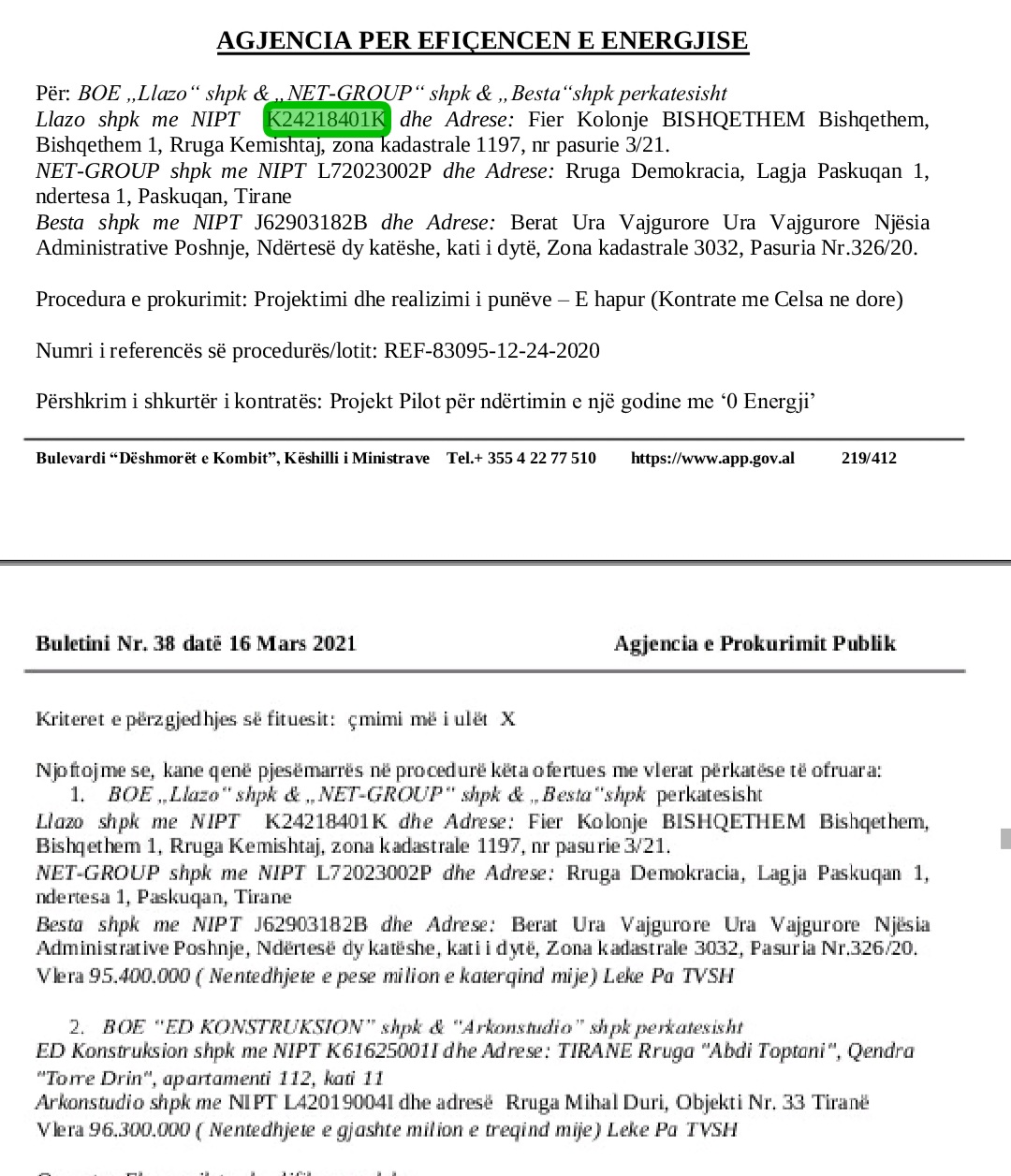 Ndërkohë, një tjetër agjenci shtetërore e ka shpallur fituese. Bëhet fjalë për Agjencinë për Efiçencën e Energjisë, e cila ka bërë një tender me objekt “projekt pilot për ndërtimin e një godine me ‘0 Energji’”. Llazo, bashkë me dy firma të tjera, janë shpallur fituese të tenderit me vlerë rreth 1 milionë euro. Pra, nga muaji në muaji tenderat e Lazo-s janë shtuar si me magji!