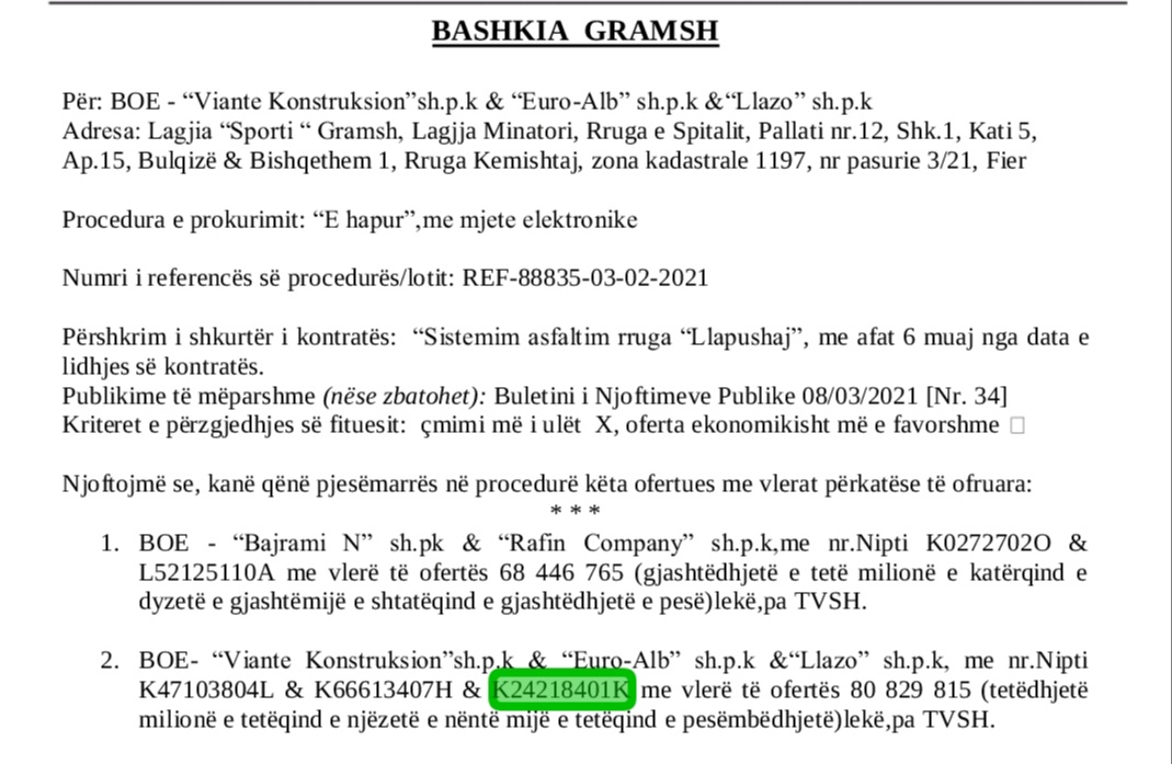 Redaksia vijoi hulumtimin, teksa u ndalëm te një procedurë nga Bashkia Gramsh, e cila ka bërë një tender me objekt “sistemim asfaltim rruga “Llapushaj”, me afat 6 muaj nga data e lidhjes së kontratës. Oferta më e ulët ka qenë me vlerë 684 milionë lekë të vjetra. Ndërkohë, Llazo bashkë me dy firma të tjera u bashkuan dhe e fituam me një vlerë plot 808 milionë lekë. Pra, gati 100 mijë euro më shumë se oferta më e ulët. Me një dorë, shteti ka humbur mundësinë që të ndërtojë një kopësht apo një çerdhe!