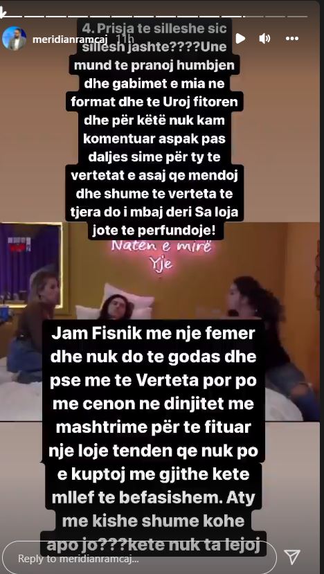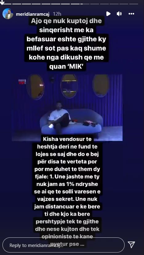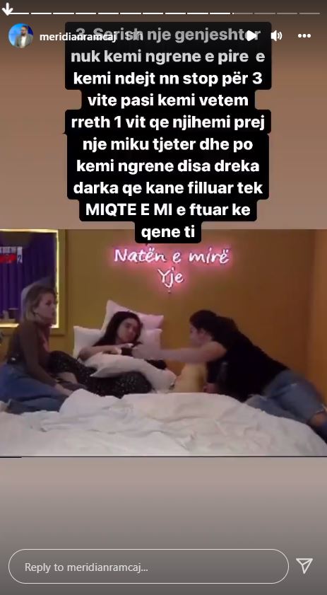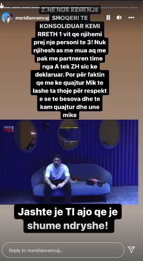 Gjatë qëndrimit të tij në “Big Brother”, Meridiani shprehu rezervat për aktoren, duke thënë se nuk e kishte pritur aq mirë, pasi jashtë kishin një raport miqësor. Aktorja ka komentuar deklaratën e tij me banorët ditën e djeshme, ku u shpreh se nuk është distancuar por ka qenë ai që nuk ka treguar afrimitet. Kjo nuk është pritur mirë nga ish banori, i cili ka shpërthyer me disa postime në Instastory.