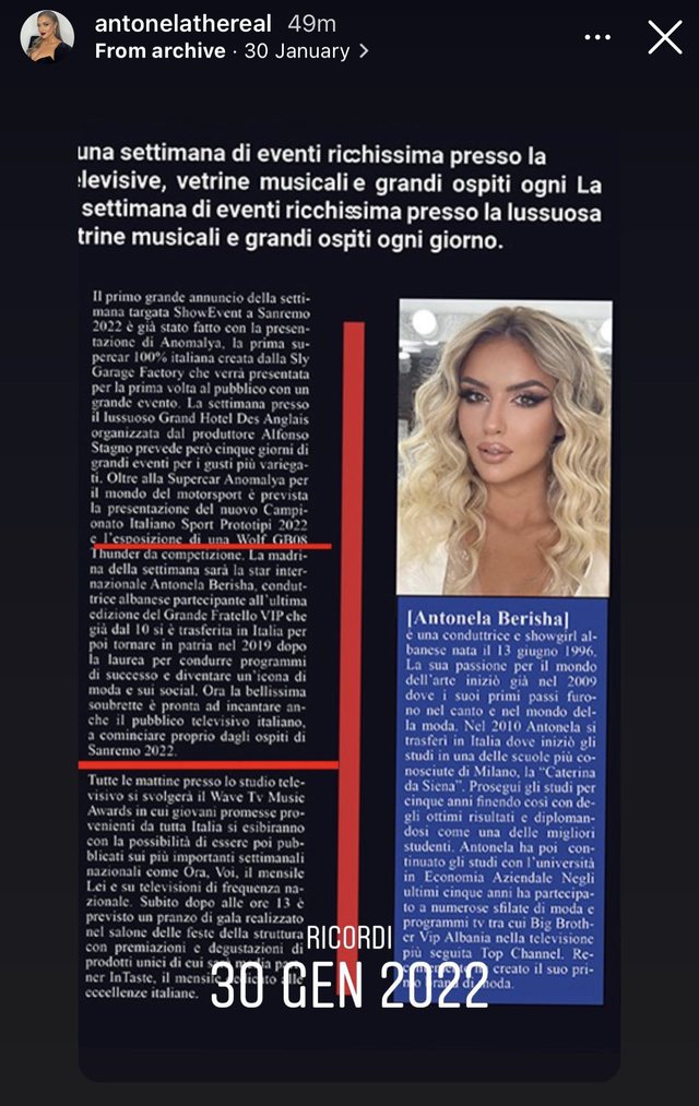 Antonela Berisha është akuzuar për mashtrim mbi lajmin se do të jetë pjesë e spektaklit të madh italian, Sanremo 2022. Kryetari i Këshillit të Medias, Koloreto Cukali, i ftuar në Top Albania Radio hodhi poshtë lajmin duke thënë se njoftimin e ka postuar vetëm një media italiane dhe më pas po i njëjti lajm është fshirë.