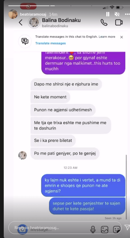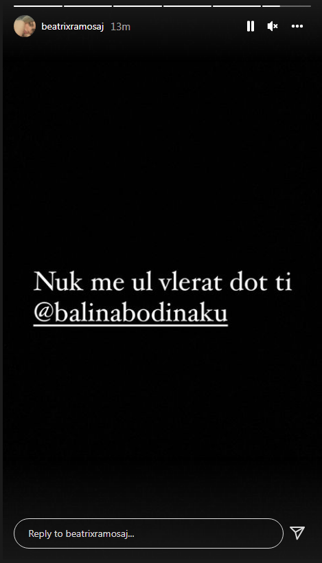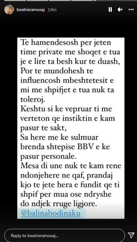 Por në faqen e saj zyrtare në Instagram, Beatrix ka publikuar disa screanshote, ku shfaqet biseda e opinionistes së Big Brother, Balina Bodinaku, që flet me dikë tjetër, ndërsa shkruan se këngëtarja kishte ikur në Dubai me të dashurin. Teksa nuk dihet nëse ky është profili i vërtetë i Balinës, Trixa nuk është përmbajtur dhe ka ka shpërthyer kundër saj. Sipas Trixës, kjo nuk është hera e parë që opinionistja ka shpifur për të, ndërsa shkruan se tashmë ka ardhur koha që ajo t’i dalë zot vetes. Ajo e paralajmëron madje se do ndjekë rrugë ligjore.
