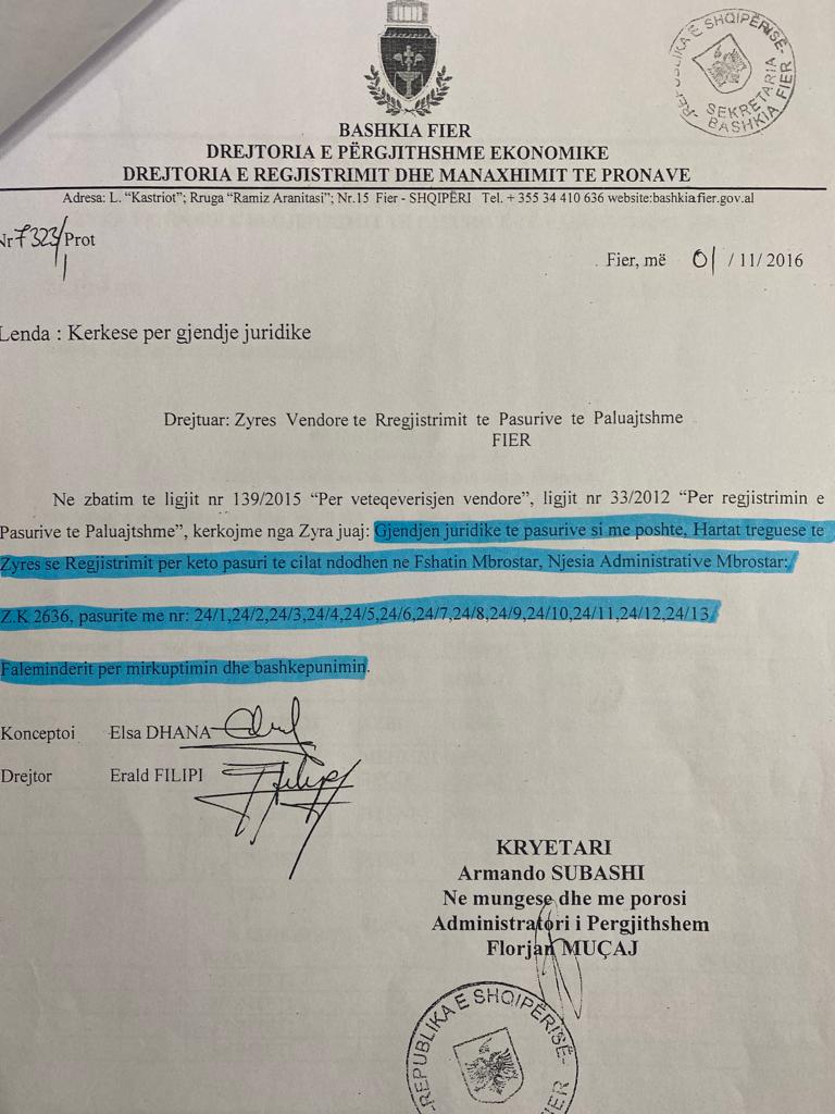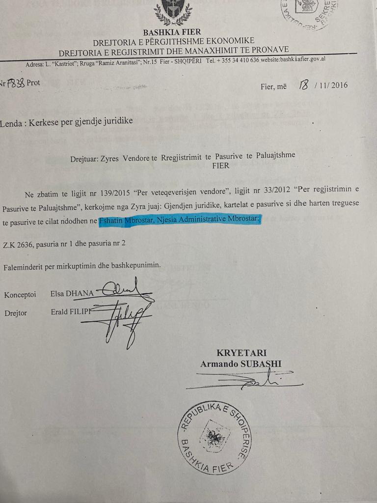 “Në vitin 2016 ndryshohet dhe shkohet në fshatin Mbyet, përsëri me firmë të Bashkisë Fier. Dhe 1 vit më pas përsëris ndryshohet dhe shkohet në fshatin Mbrostar, njësia administrative Mbrostar; përsëri me firmë të kryetarit të Bashkisë Fier, z.Armando Subashi”, u shpreh Tabaku në konferencën e saj për shtyp.