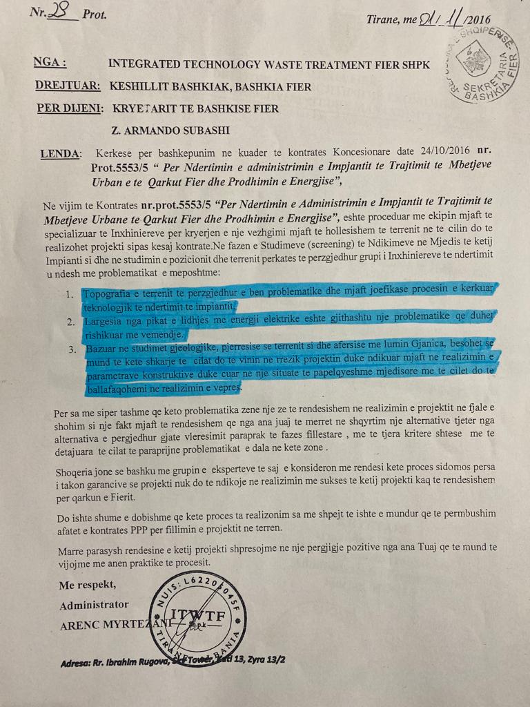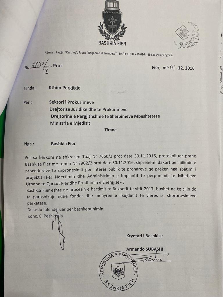Një vit më pas bashkia Fier informohet se ka nisur një praktikë për dhënie me koncesion për incinerator.