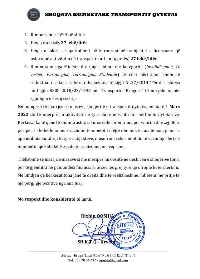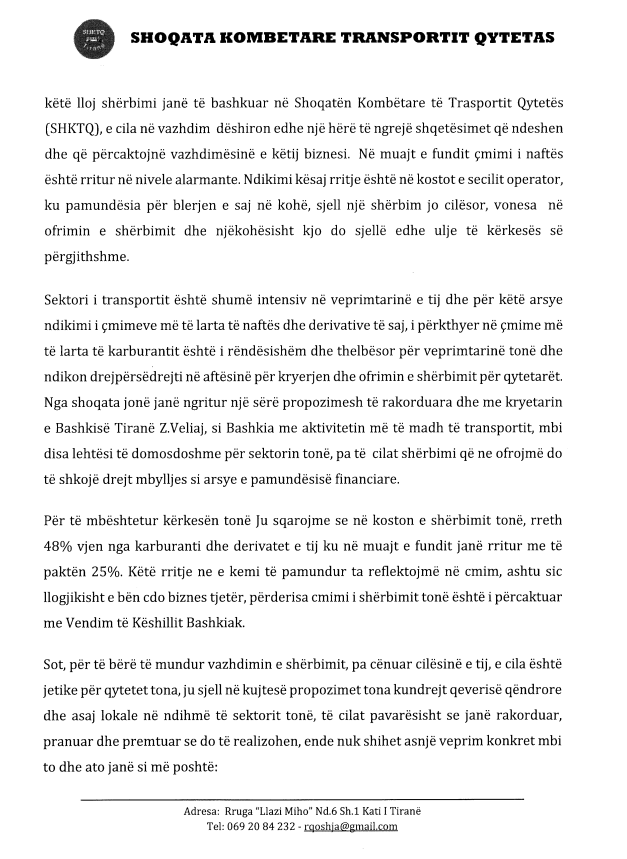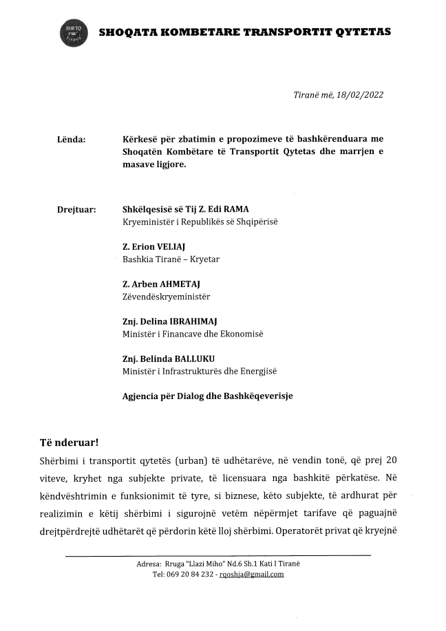 Shoqata Kombëtare e Transportit Qytetas i ka nisur një letër këtë të Hënë Edi Ramës, Erion Veliajt e Ahmetajt, Ballukut, për plotësimin e disa kushteve.