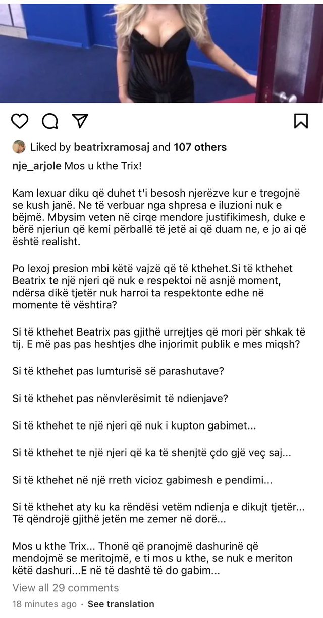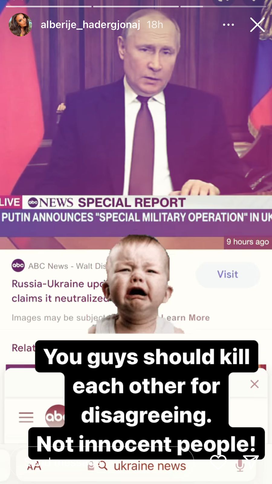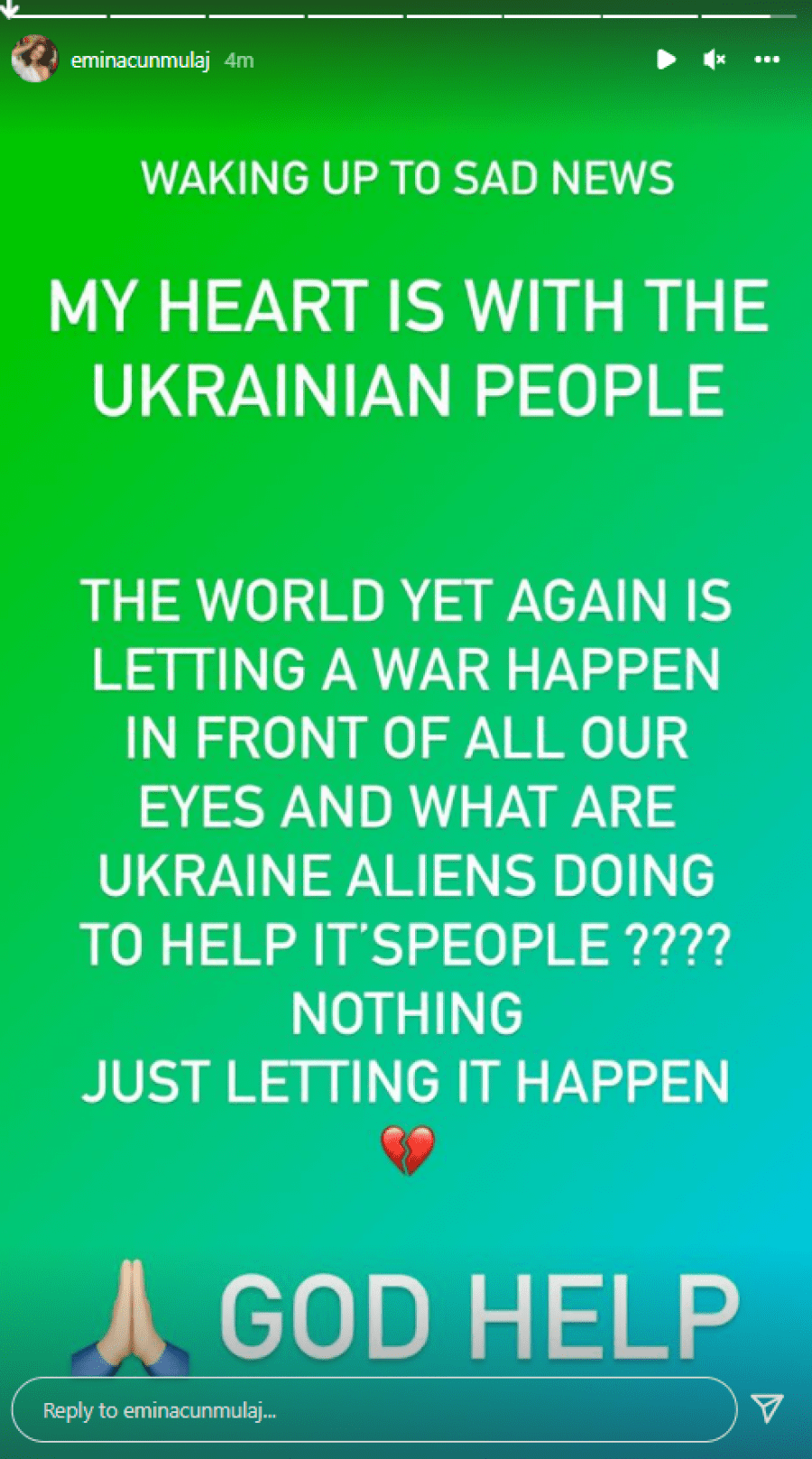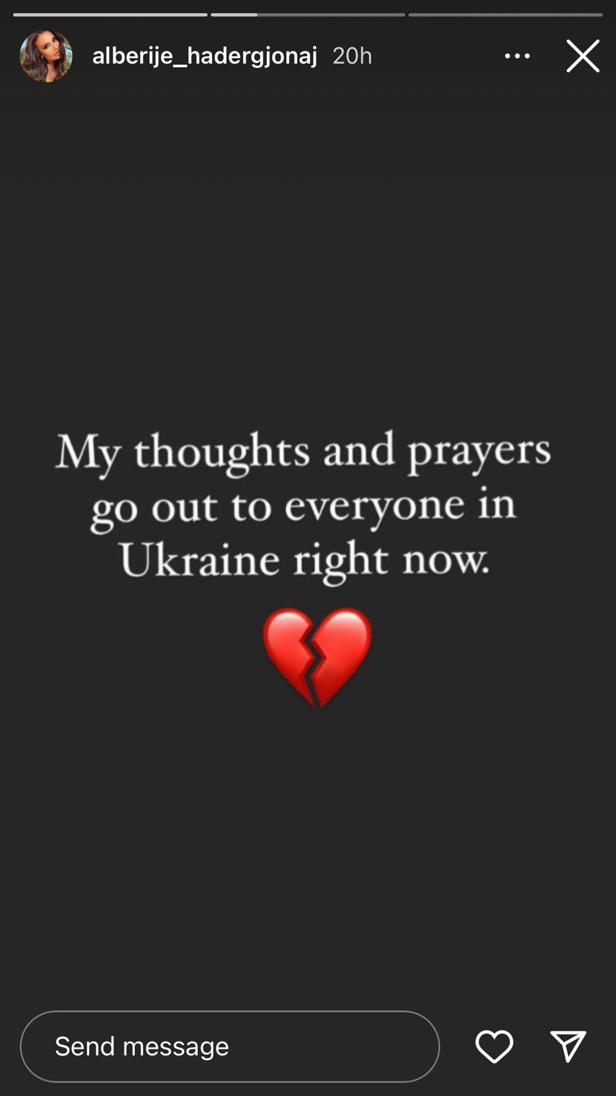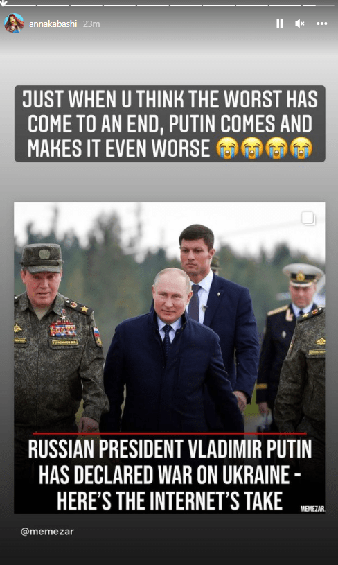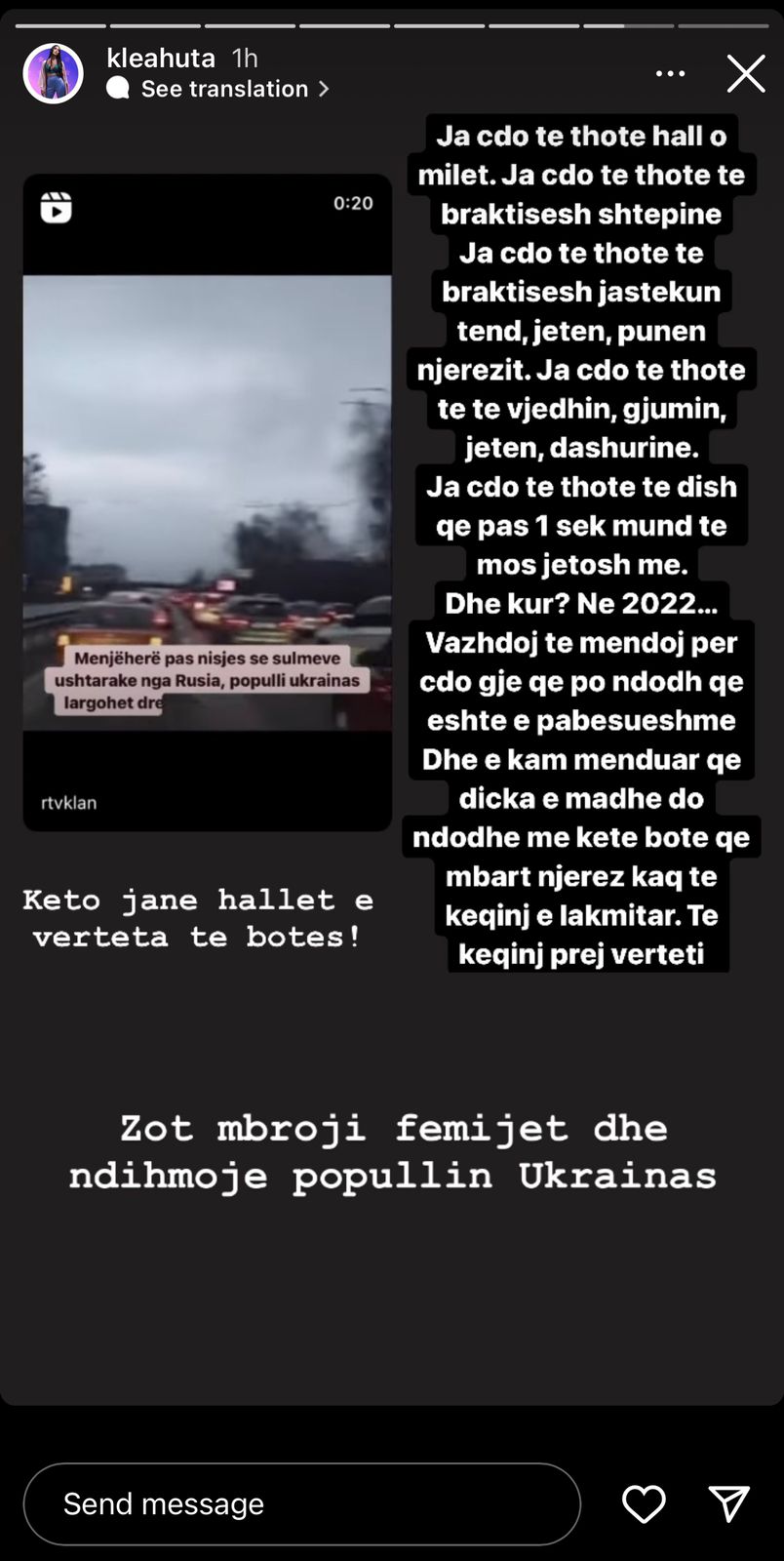 “Ja çdo të thotë hall o milet. Ja çdo të thotë të braktisësh shtëpinë. Ja çdo të thotë të braktisësh jastëkun tënd, jetën, punën, njerëzit. Ja çdo të thotë të të vjedhin, gjumin, jetën, dashurinë. Ja çdo të thotë të dish që pas 1 sek mund të mos jetosh më. Dhe kur? Në 2022. Vazhdoj të mendoj për çdo gjë që po ndodh që është e pabesueshme Dhe e kam menduar që diçka e madhe do ndodhe me këtë botë që mbart njerëz kaq të këqinj e lakmitar. Te keqinj prej vërteti”- shkruan Klea Huta.