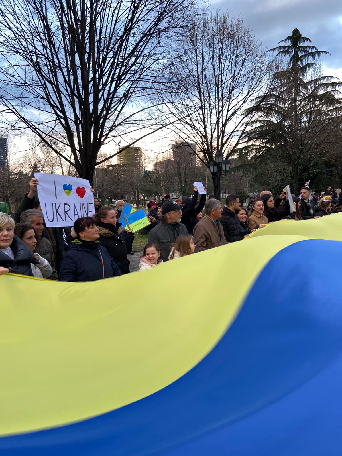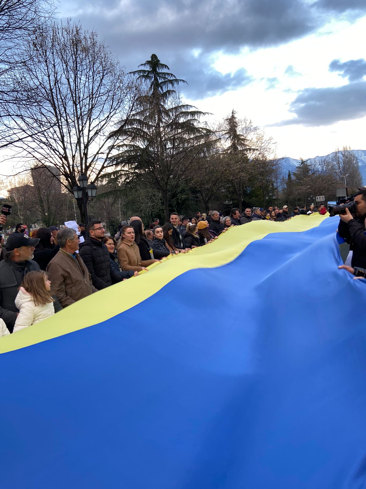 Për të kundërshtuar sulmin rus ndaj Ukrainës, – sulmi i cili vijon për katër ditë me radhë -, demostruesit shpalosën një flamur të madh, ukrainas.