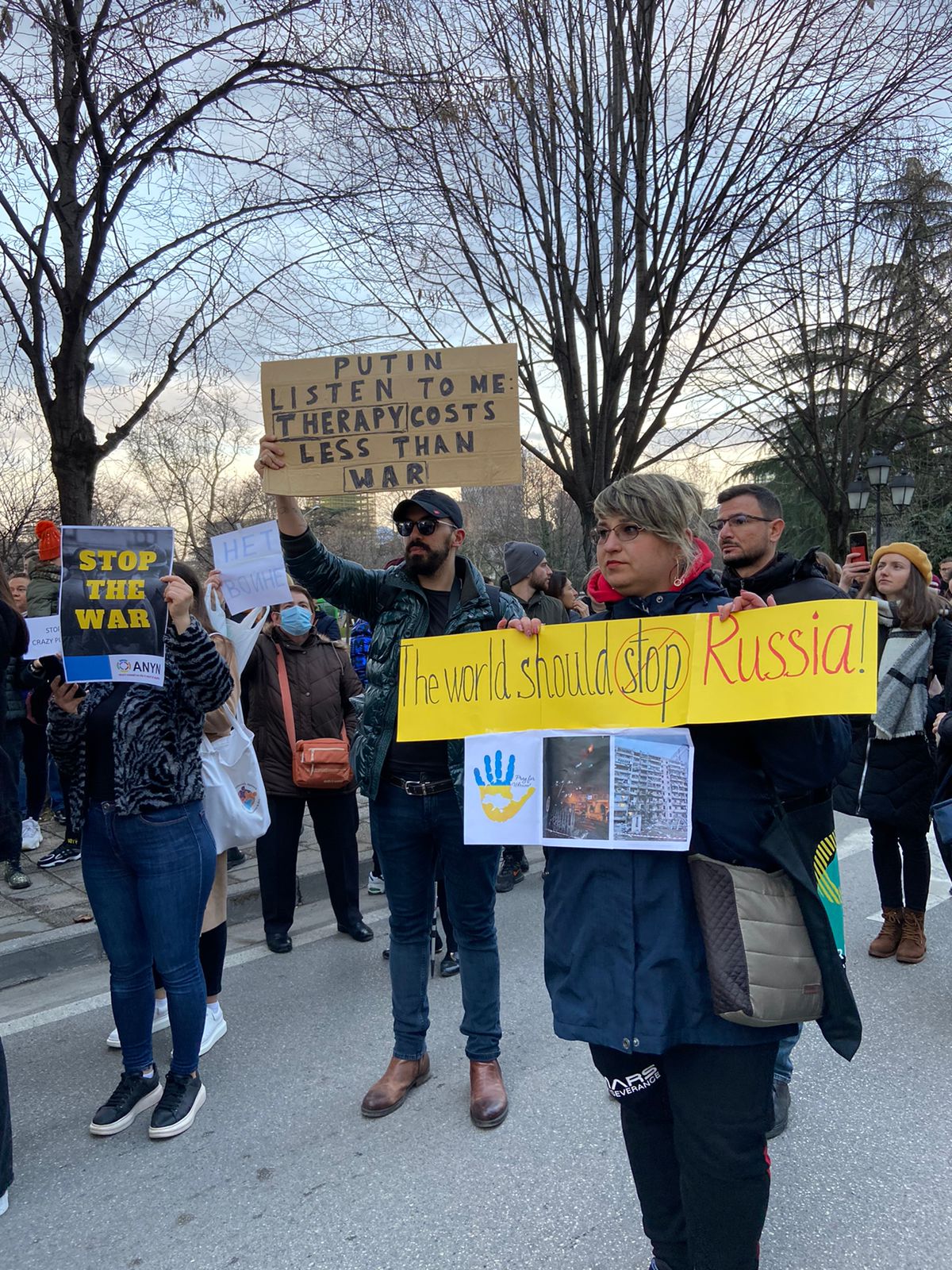 “Stop luftës”, “Putin, terapia kushton më shumë se lufta”, “Bota duhet ta ndalojë Rusinë”, janë disa nga parnkartat në duart e protestuesve.