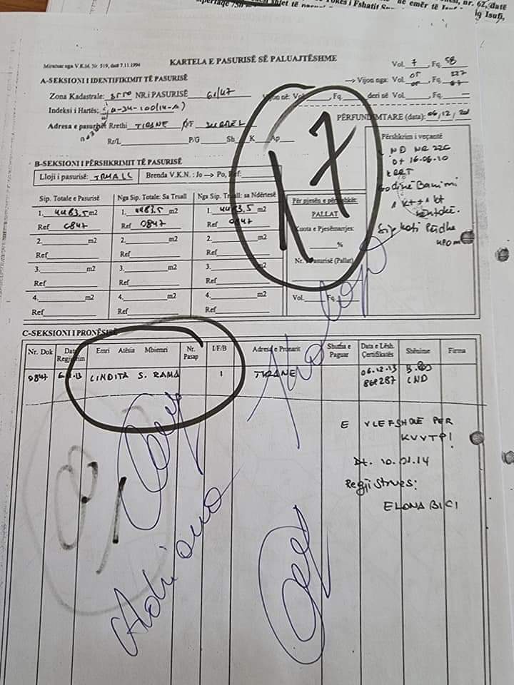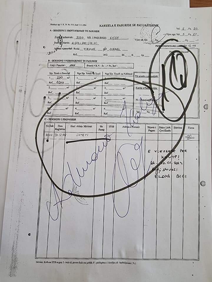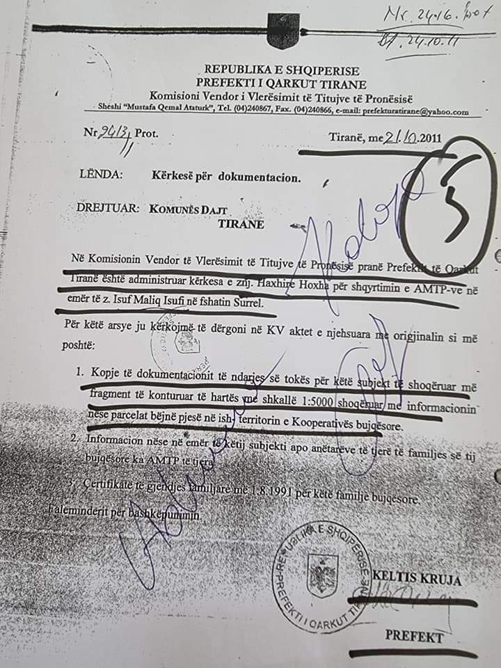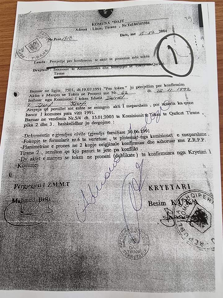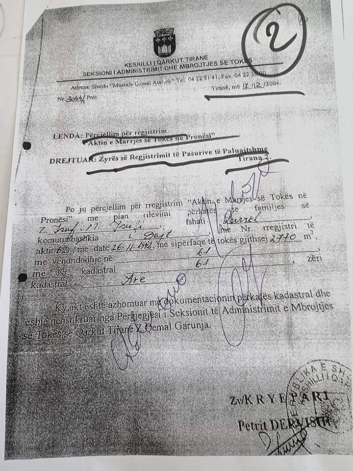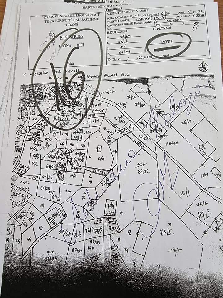 Në dokumentet e publikuara, ajo pretendon se hedh dritë mbi atë se prona, që cilësohet e grabitur nga bashkëshortja e Kryeministrit, ndodhur në Fshatin Surrel, Dajt, Tiranë, është ndarë sipas Ligjit Nr.7501 (foto 1, 2).