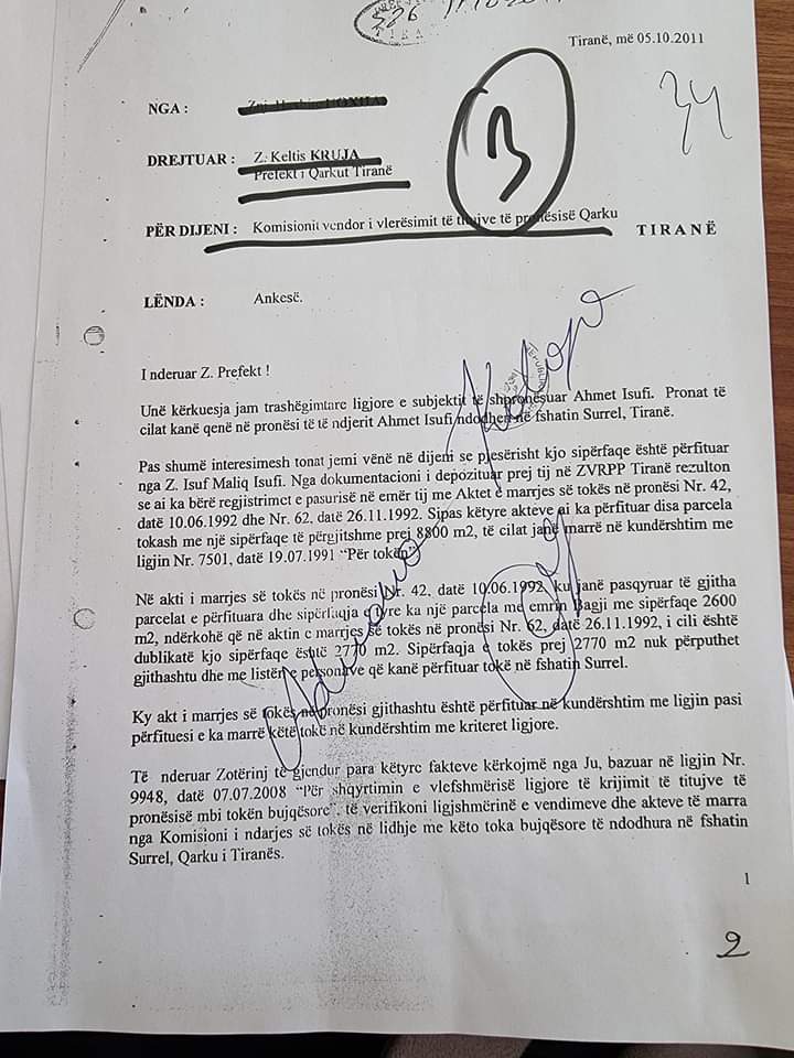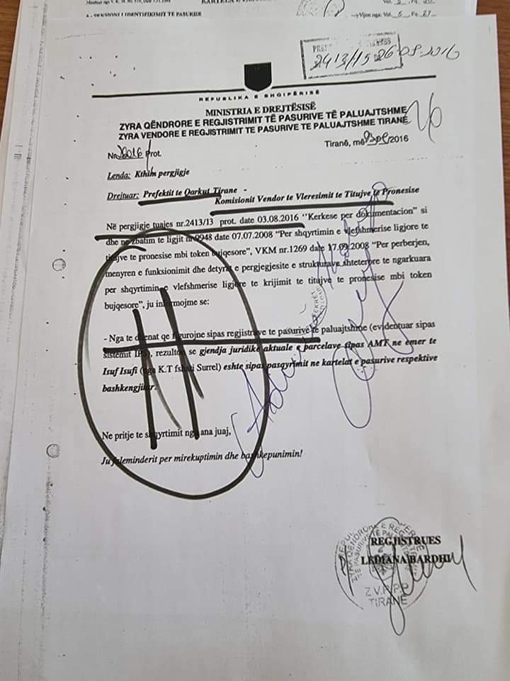 Në vijim thuhet se sipas ankueses H. H., është vënë në lëvizje Prefekti i Qarkut Turanë (foto 3, 4), ku denoncon se veprimet e shretasit I. I., për tu pajisur me dublikat të Aktit të Marjes së Pronës, janë bërë në kundërshtim me Ligjin Nr.7501.