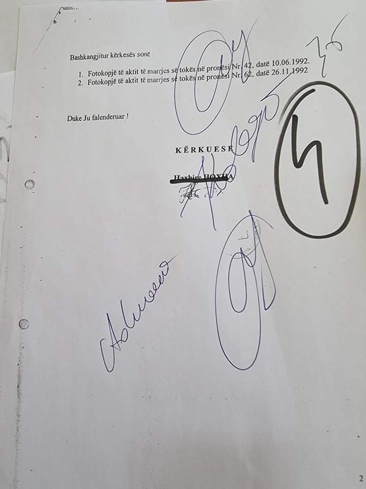 “Shfuqizimin e e plotë të Aktit të Marjes aë Tokës Vujqësore në Pronësi Nr.42 datë 10.06.1992, Nr. – datë 19.01.1992, Nr.62 datë 20 04.1991 dhe NR.62 DATË 26.11.1992 si dhe detyrimin për kthimin e tokës SHTET” (fotot 12, 13, 14, 15).