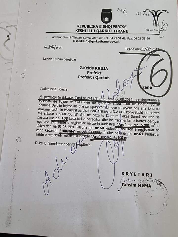 Ndërkohë, sipas pērgjigjes ardhur nga Agjensia Shtetërore e Kadastrës (ish ZRPP), në dispozicion të Prefektit të Qarkut vë të gjithë hartar dhe kartelat e oronës ndaj së cilës kishte filluar hetimi administrativ (fotot 10, 11).