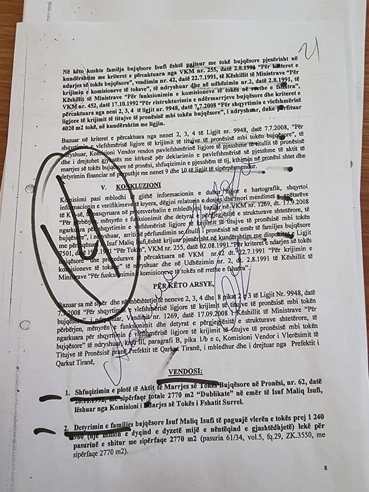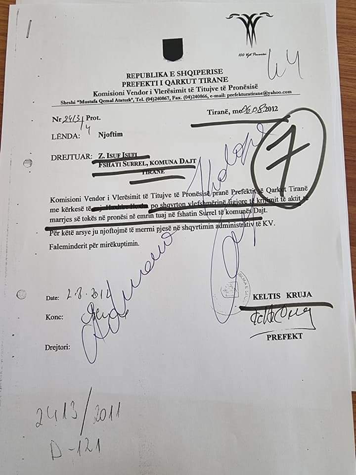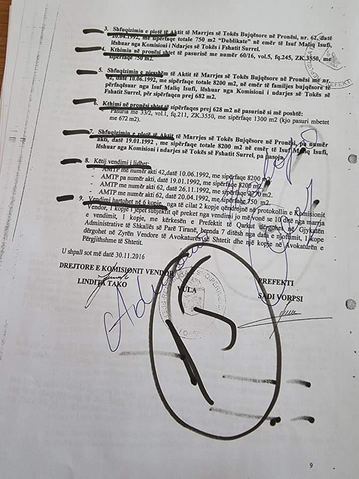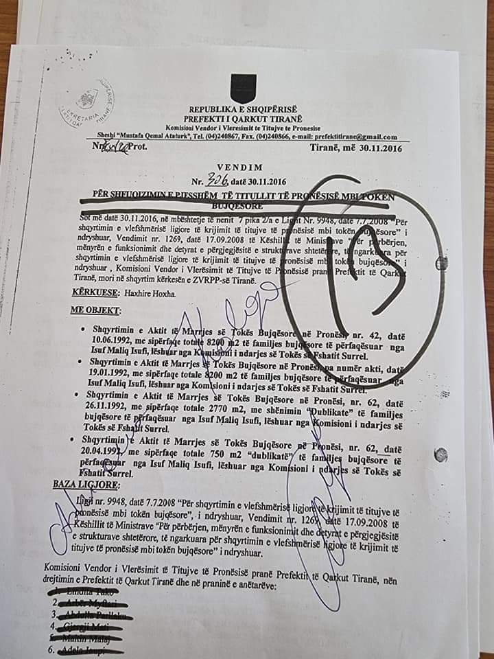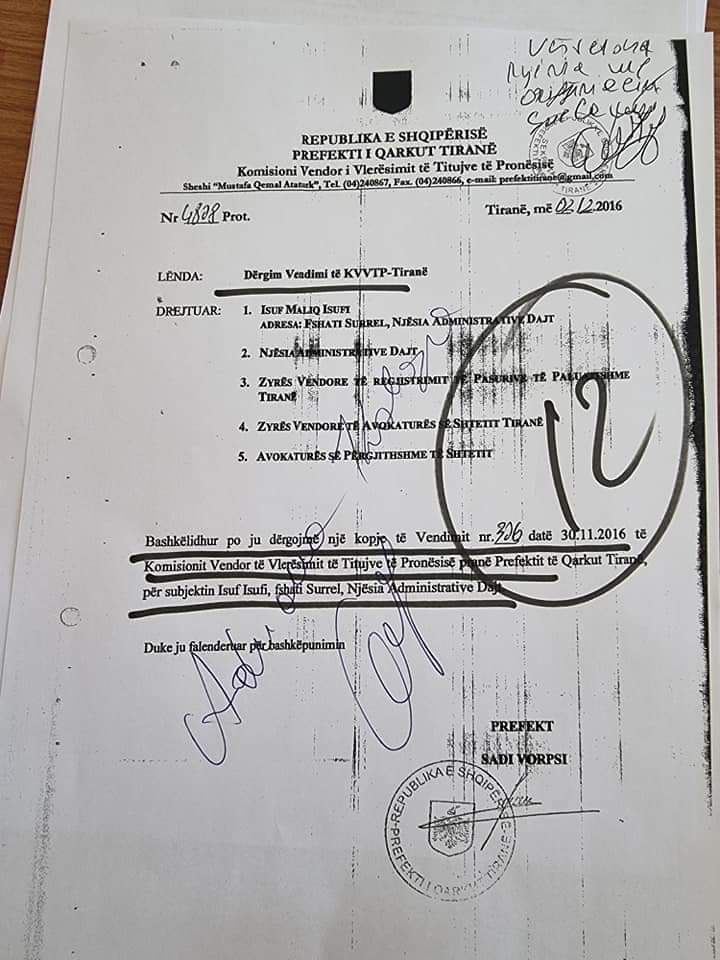 Në vijim të denoncimit të publikuar thuhet se “bazuar në këto prova, Prefekti i Qarkut, i dërgon përfituesit I. I., etj., Vendimin Nr. 326 datë 02.12.2016 ku i komunikohej se Komisioni Vendor i Vlerësimit të Titujve :të Pronësisë pranë Prefektit të Qarkut Tiranë: