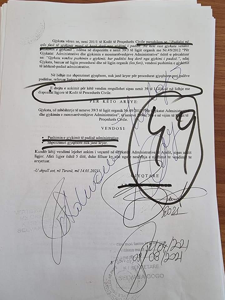 Sipas saj, ky vendim ankimohet nga pala e paditur, ndërkohë që në lojë futet familja Kryeministrore e cila, pas ushtrimit të ndikimit të paligjshëm dhe presionit mëpërmjet Vetingut arrin që Gjykata Administrative e Apelit të prishë vendimin e Shkallës së Parë dhe kthimin e dosjes po në të njëjtën Gjykatë por me tjetër trup gjykues.