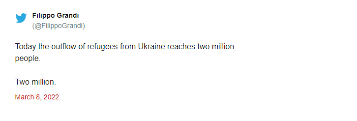 Komisioneri i Lartë i OKB-së për refugjatët thotë se numri i njerëzve që janë larguar nga Ukraina që nga pushtimi i Rusisë sot ka arritur në dy milionë.