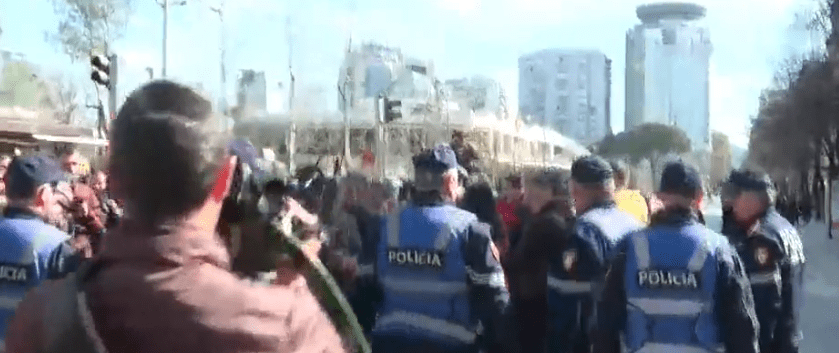 Me ndërhyrjen e efektivëve të policisë, qytetarët u zhvendosën në trotuar. Për disa moment pati tensione, teksa disa nga protestuesit kundërshtuan lirimin e rrugës, ndërsa efektivët i shtynë me trup drejt trotuarit.