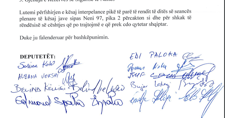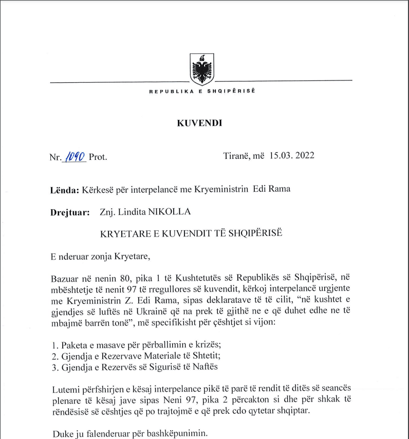 Në kërkesë thuhet se bazuar në nenin 80, pika 1 e Kushtetutës, në mbështetje të nenit 97 të Rregullores së Kuvendit, kërkohet interpelancë urgjente me kryeministrin Rama.