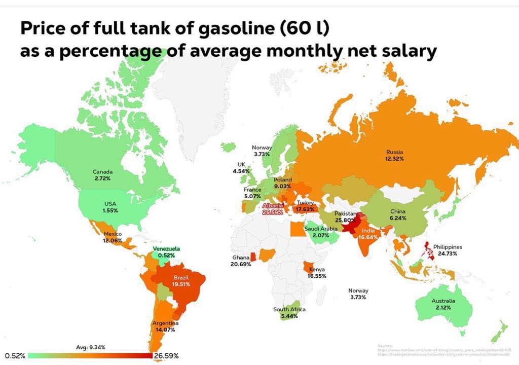 Deputetja demokrate Jorida Tabaku, me anë të një postimi në “Facebook” ka publikuar një hartë, ku shfaqet raporti ndërmjet çmimit të naftës dhe rrogave në vende të botës.