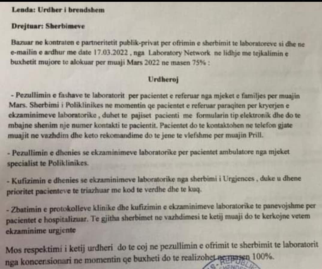 Shehu shprehet se sot një urdhër ministerial ndalon për qytetarët analizat në laboratoret publike, edhe ato të kërkuara nga mjeku i familjes duke thënë se kanë mbaruar fondet.