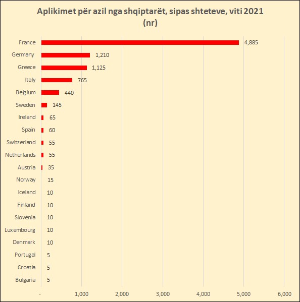 Statistikat e Eurostat bëjnë të ditur se preferenca e shqiptarëve për të aplikuar për azil mbetet Franca, që në vitin 2021 mori rreth 4900 aplikime, ose 54% të totalit. Franca mbetet e preferuar për shkak të lehtësive që ka në bërjen e dokumenteve, mosdëbimeve dhe lehtësive sociale.