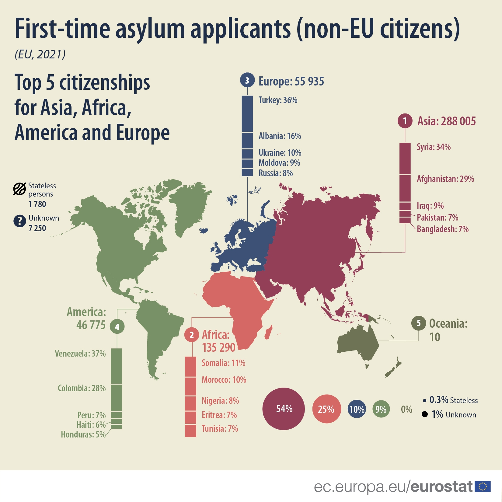 Më shumë se gjysma (54%) e azilkërkuesve për herë të parë në 2021 kishin nënshtetësi aziatike, ndërsa 25% kishin nënshtetësi afrikane, 10% shtetësi evropiane (jo-BE) dhe 9% nënshtetësi amerikane.