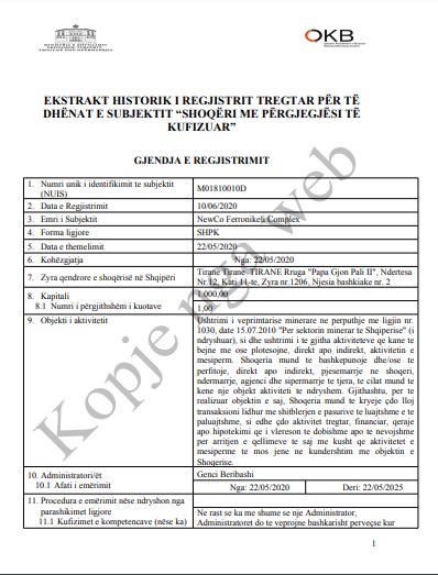 Boldnews.al hulumtoi se kush është pronar i kompanisë “NewCo Ferronikeli Complex”, e cila fitoi edhe shfrytëzimin e lejes minerare në Kukës. Kompania është regjistruar në Shqipëri në qershor të vitit 2020, teksa administrator i saj është z.Genci Beribashi. Ky i fundit punonjës i grupit Balfin, pronë e z.Samir Mane.