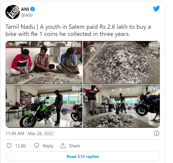 Një i ri në Tamil Nadu të Indisë grumbulloi monedha një rupi gjatë tri viteve për të blerë motoçikletën e tij të ëndrrave.