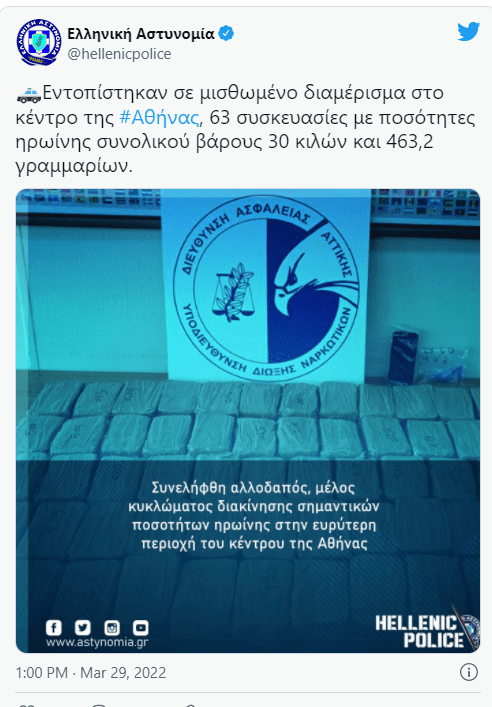 Ai u vendos në pranga pas konfirmimit të informacionit mbi aktivitetin e tij të paligjshëm. Gjithashtu, policia greke bastisi edhe banesën e tij të marrë në me qira në Athinë, ku agjentët gjetën heroinë me peshë gjithsej 30 kg e 463 gram.