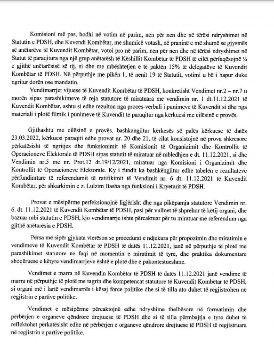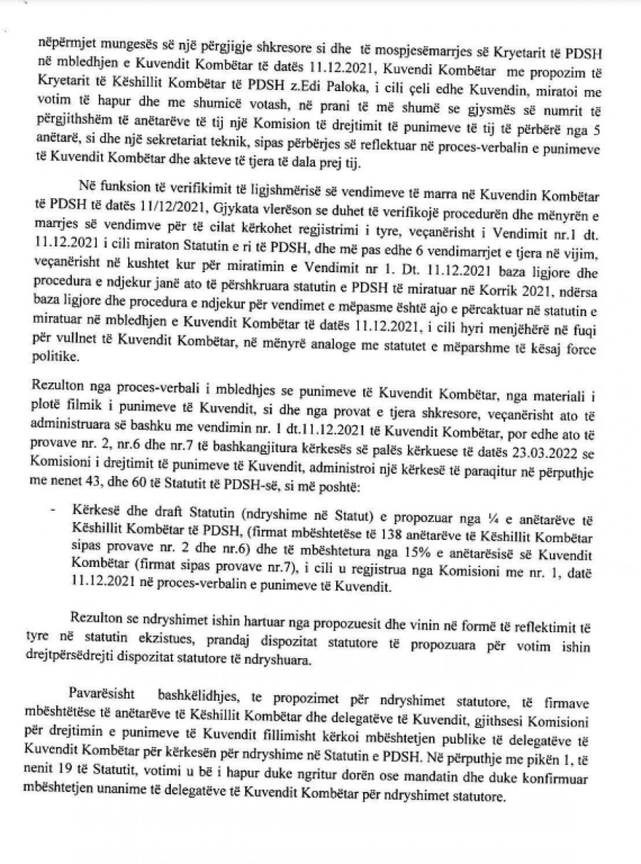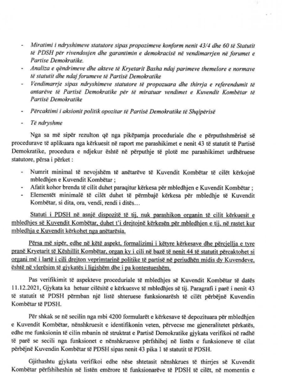 Pasi ka konstatuar legjitimitetin e Mbledhjes së Kuvendit Kombëtar, gjykata më pas ka analizuar vendimet e tjera të marrë në 11 Dhjetor 2021, duke nisur nga ndryshimet statutore të Partisë Demokratike.