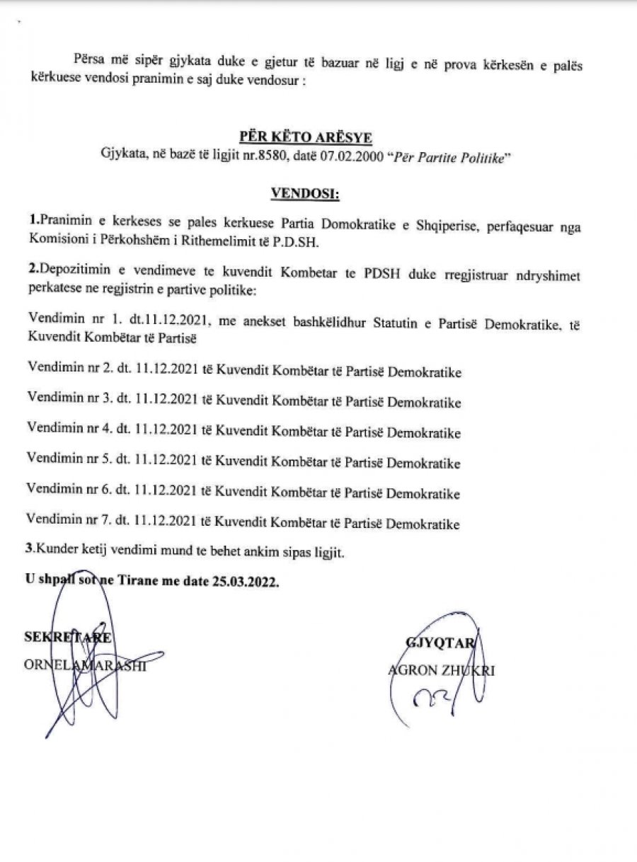 Gjykata e Tiranës ka zbardhur vendimin që njohu Kuvendin e PD-së zhvilluar më 11 Dhjetor 2021 dhe vendimet e marra prej tij.